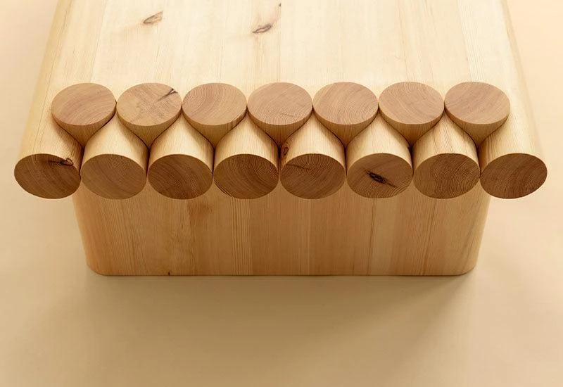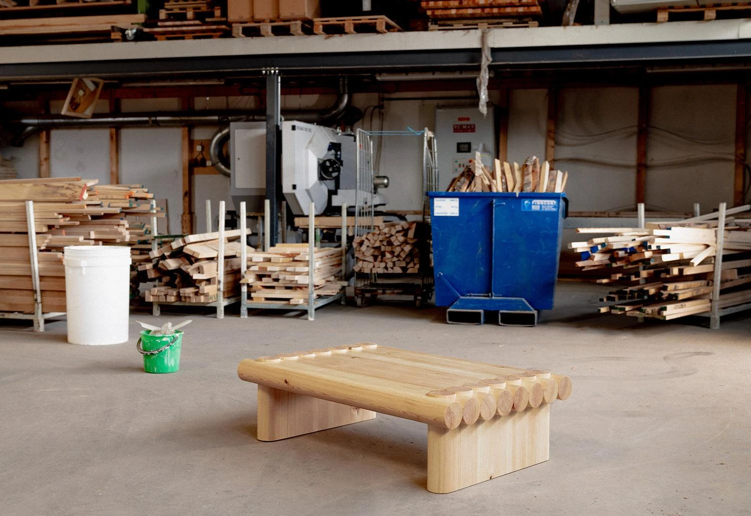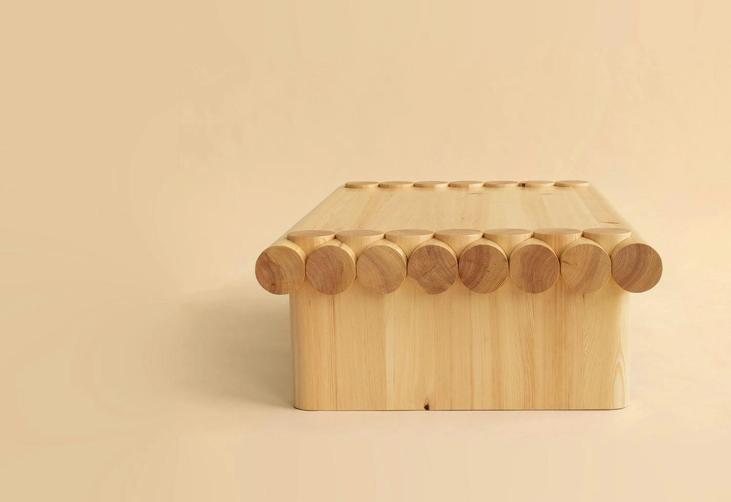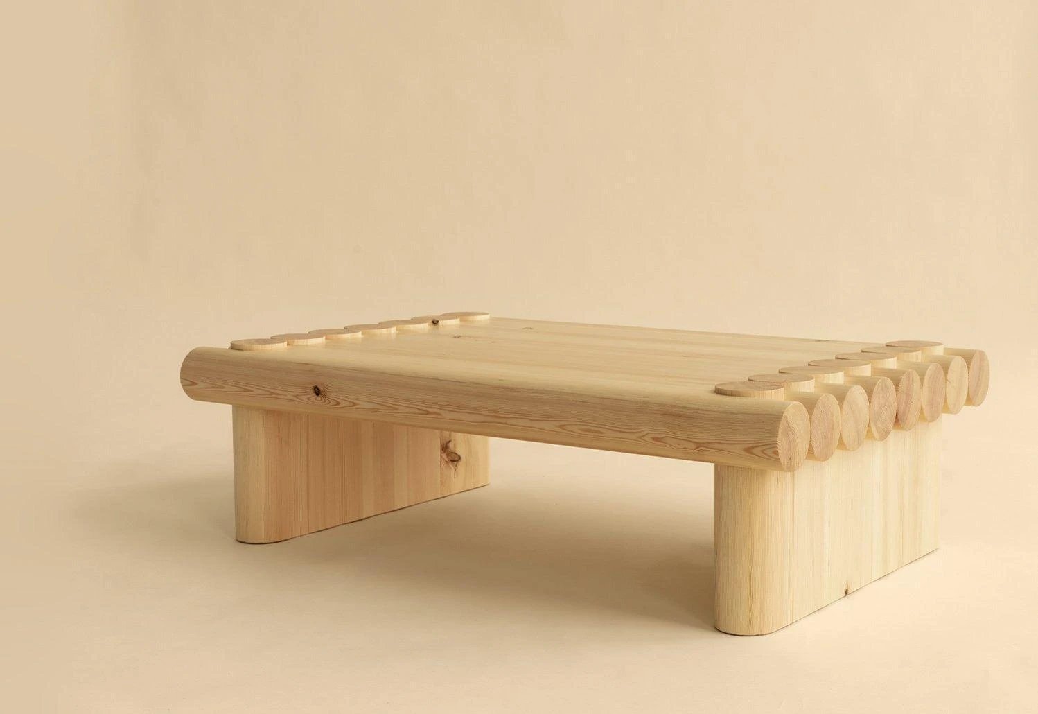 The substantial 004 Coffee Table proffers generous proportions, boldly expressing the natural qualities of the wild pine it’s crafted in. The table is a celebration of fundamental construction techniques, boasting amplified notch joints that resemble the walls of traditional Finnish log houses.
