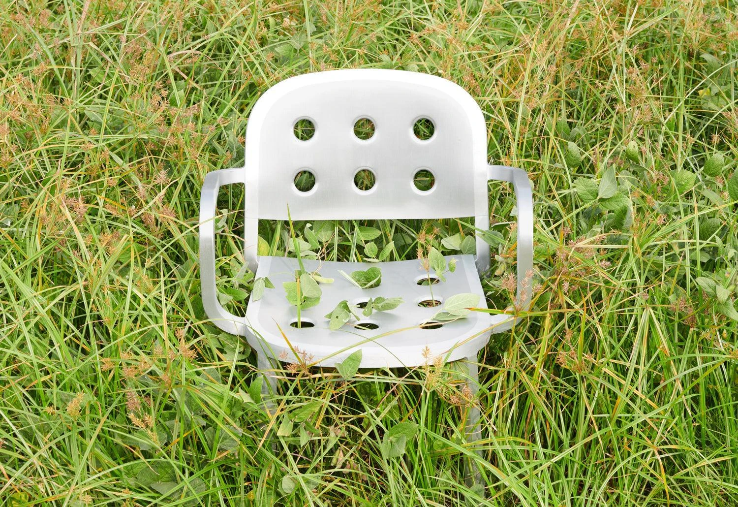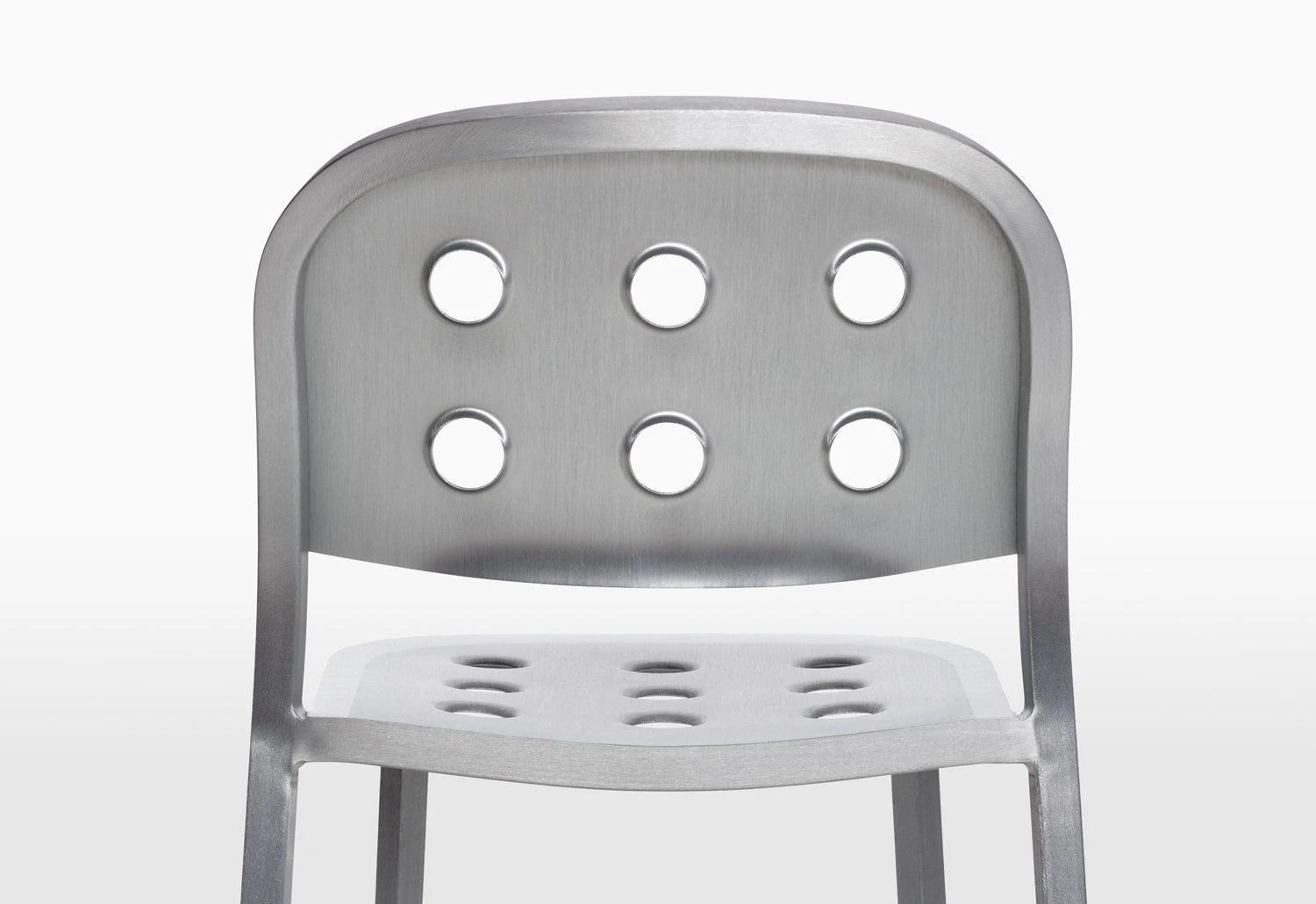The 1 Inch collection of stools are durable, lightweight and made of recycled aluminium. Emeco engineers used tools from the automotive industry to create holes in the seat and back which, when used outside, allow for rain to drain and wind to blow through.