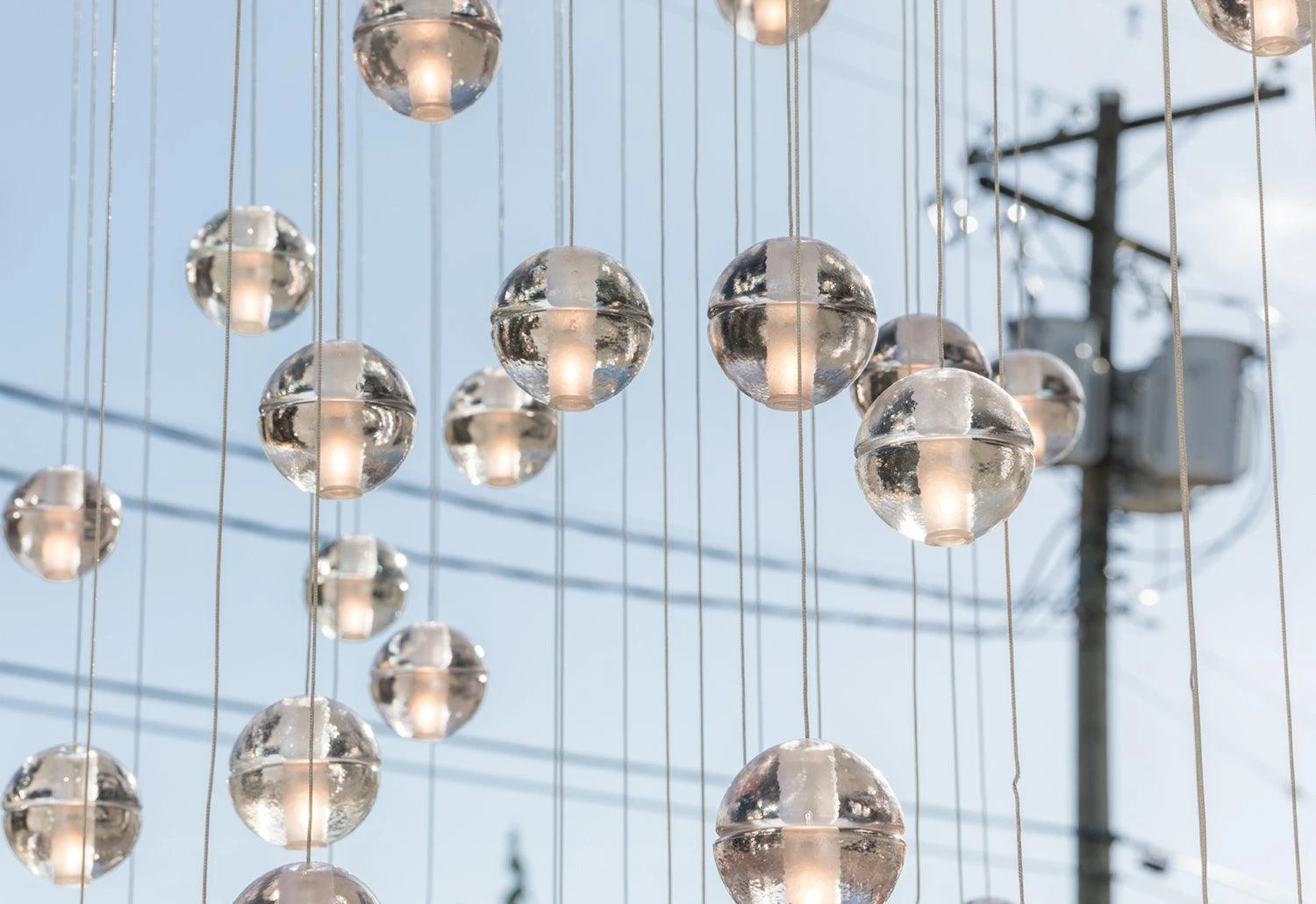 An articulated cast glass hemisphere with a frosted cylindrical void that houses a low voltage or LED lamp. Individual pendants are visually subtle but gain tremendous strength when multiplied and clustered in large groups.