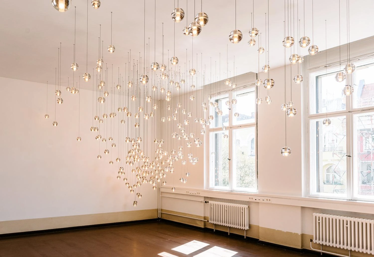 The light interacts with the imperfections, rifts, bruises and bubbles of the cast glass to make a rich halo of light.