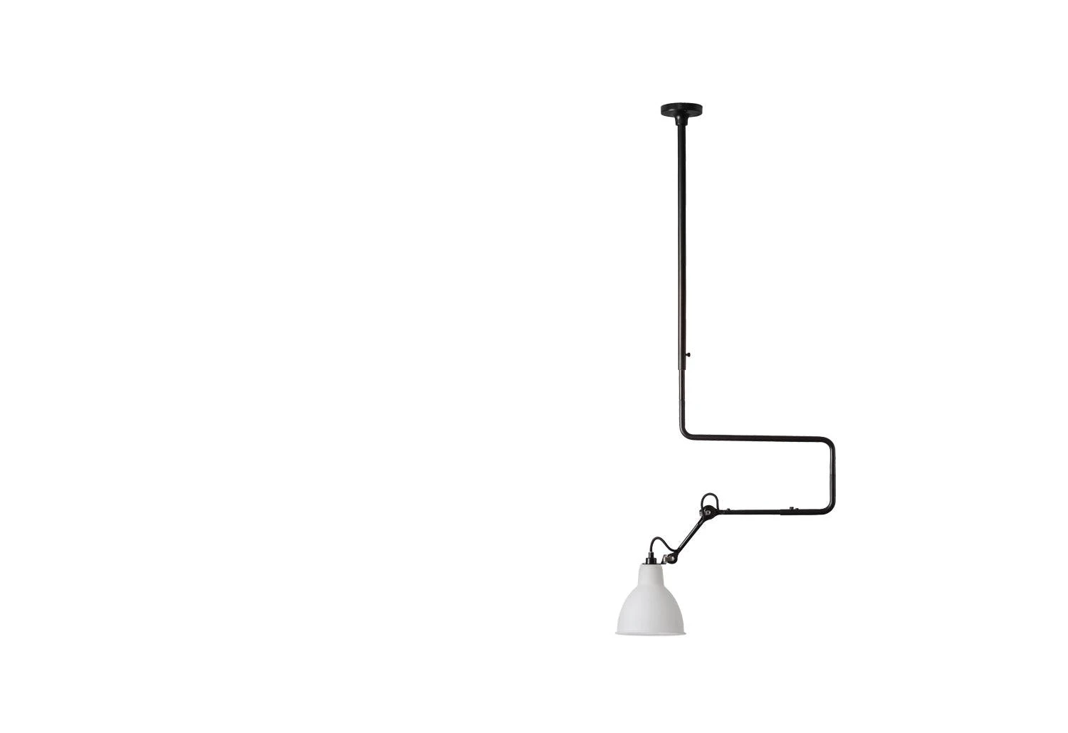 A very distinctive hanging ceiling lamp, very graphic and practical with its extension. The height of the lamp can be adjusted. IP 20 rated.