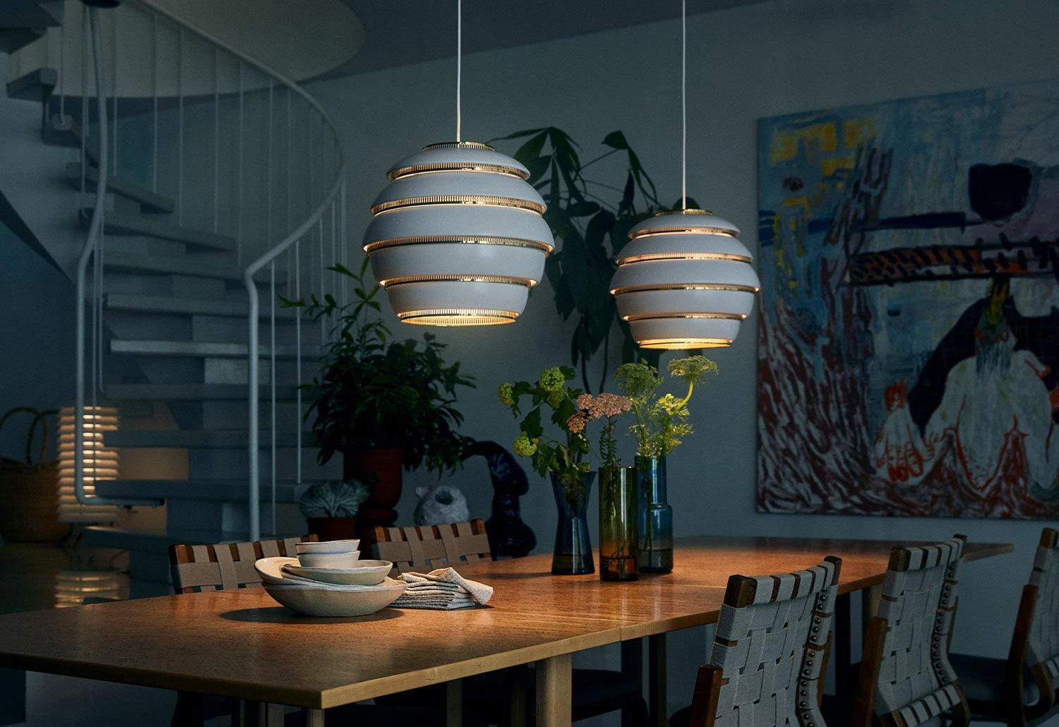 This white pendant light was first introduced in the interior design of the University of Jyväskylä. Decorative and sculptural even when unlit, the Beehive lamp has been the most popular home lighting item in the Artek range.