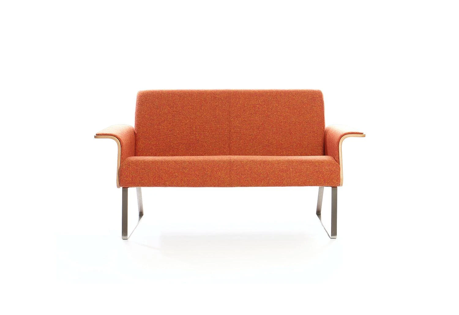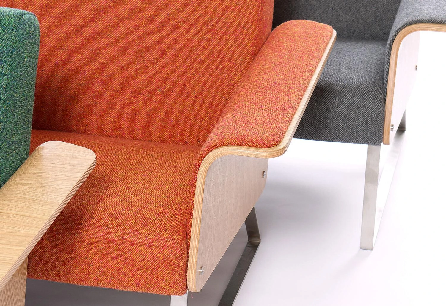 The structure of the design is clearly revealed with fixings exposed and the upholstery unit raised on stainless steel legs. The design for Avian incorporates the option of an upholstered liner for the inside face of armrests.