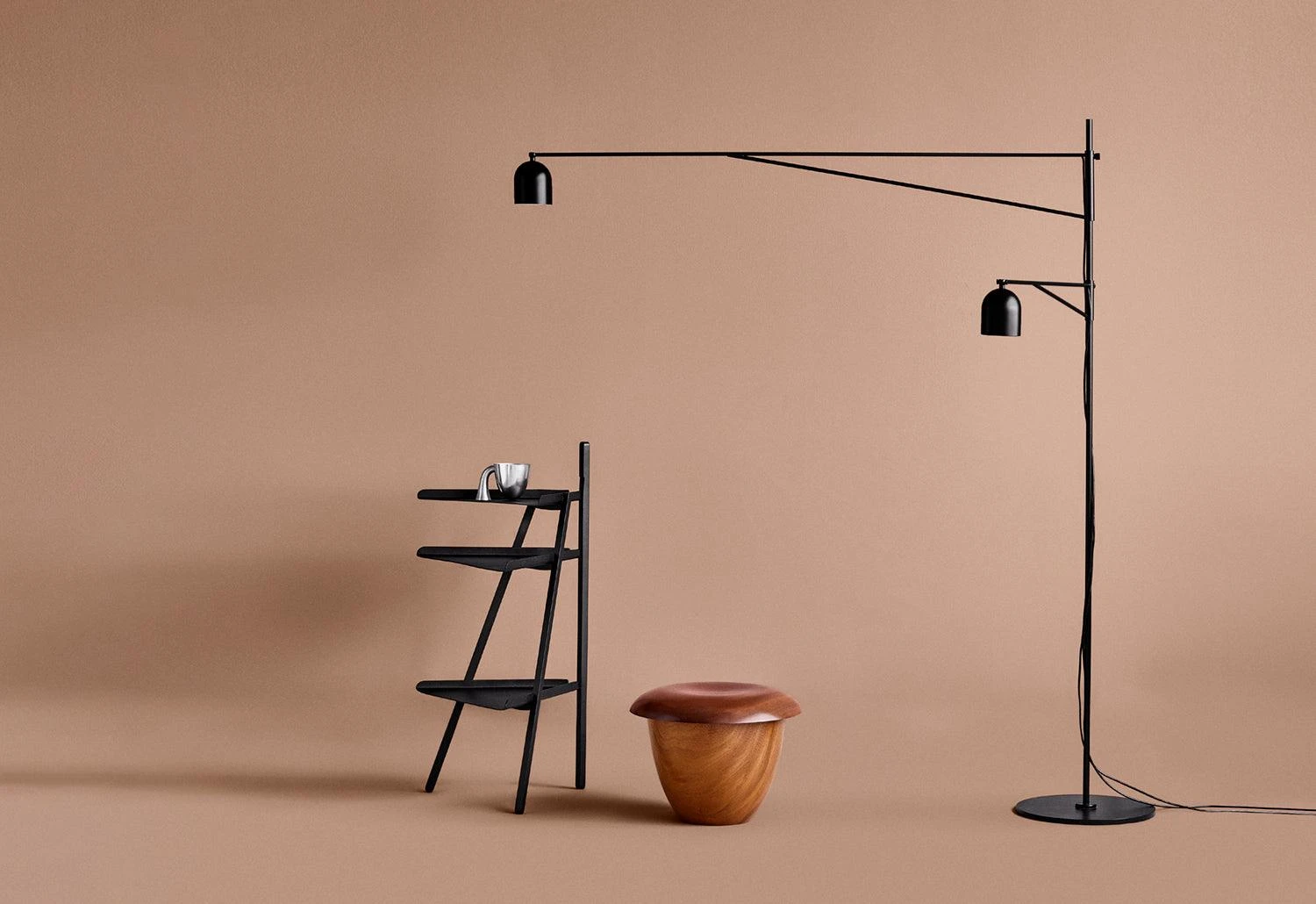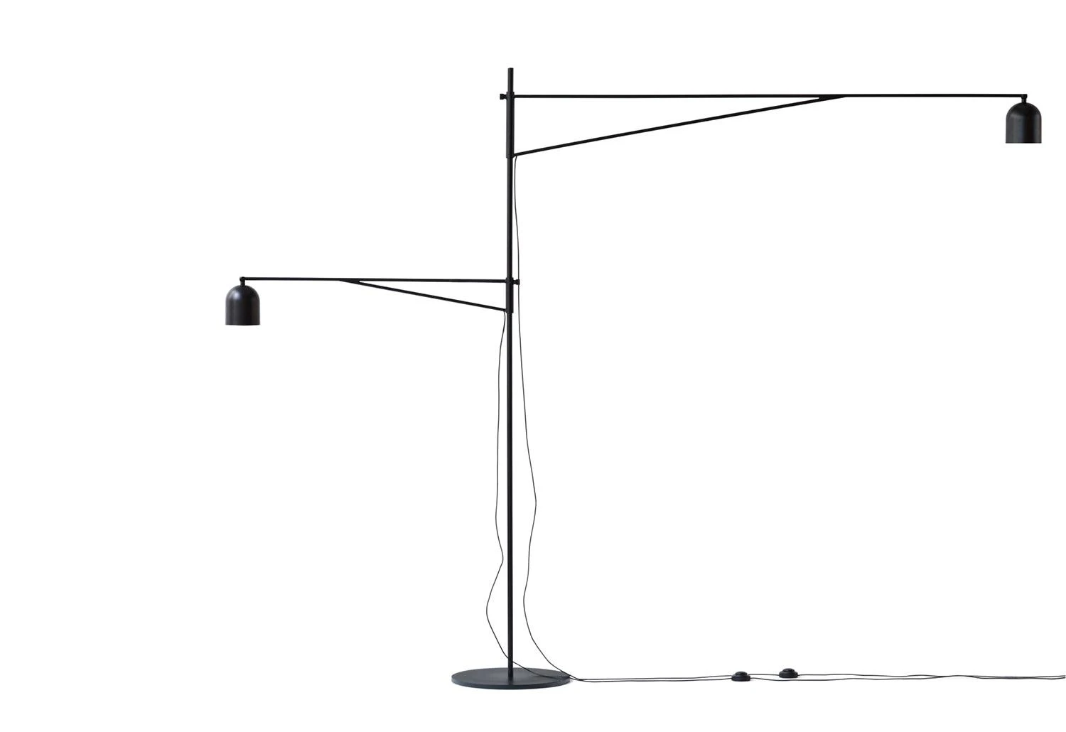 The long and slender design of the Awkward floor light has a deliberately unusual form with long arms to illuminate from two shades within its immediate vicinity.