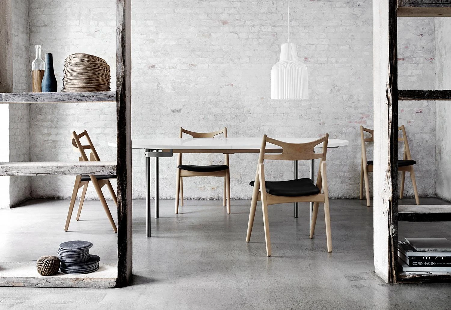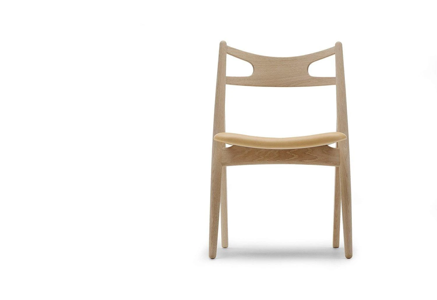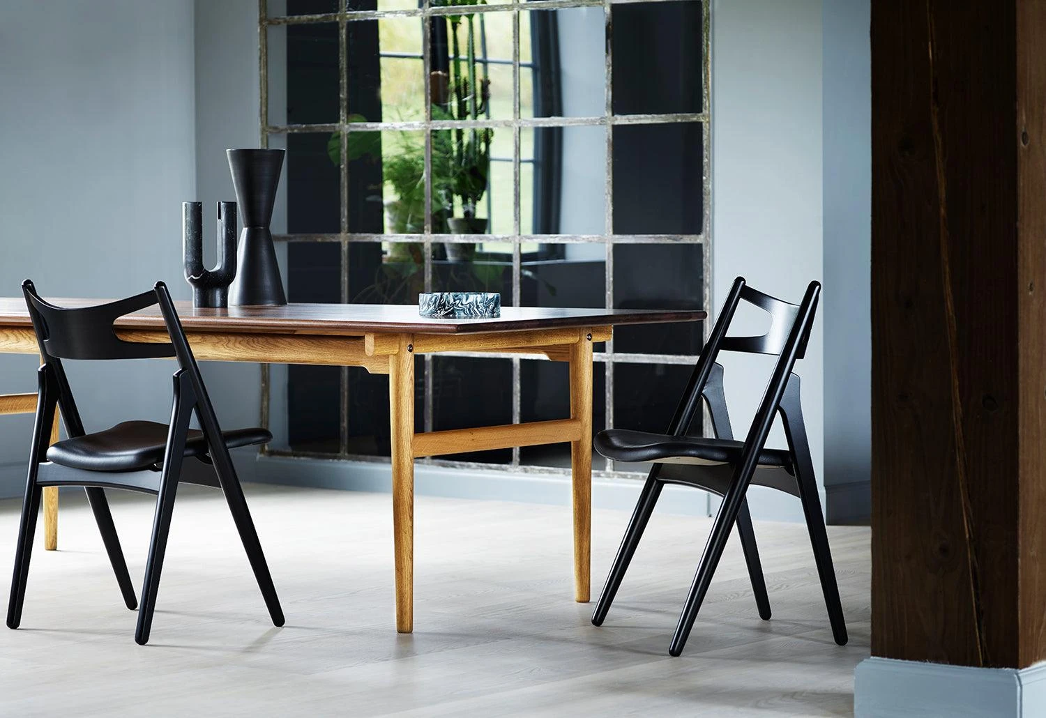 The classic CH29 dining chair, designed in 1952 by Hans Wegner, is also called ‘The Sawbuck Chair’ because of the shape of the legs of the chair which resemble the sawbucks or saw horses traditionally used by carpenters and woodcutters. The CH29 offers great comfort as well as being a distinctive and sculptural piece of furniture.