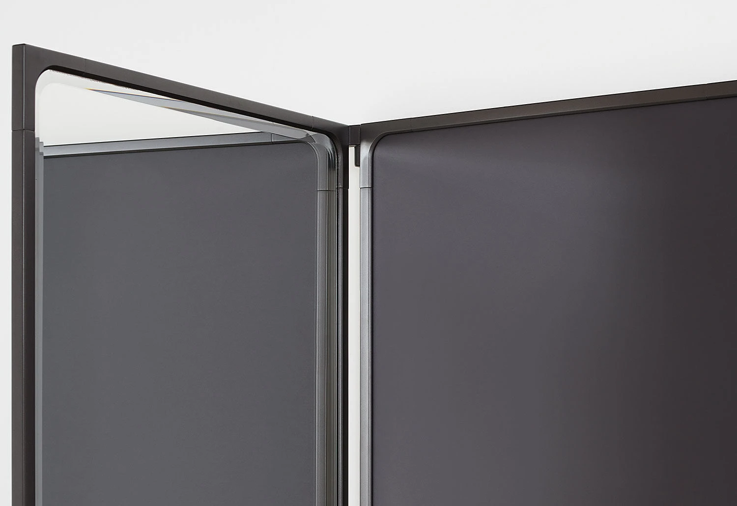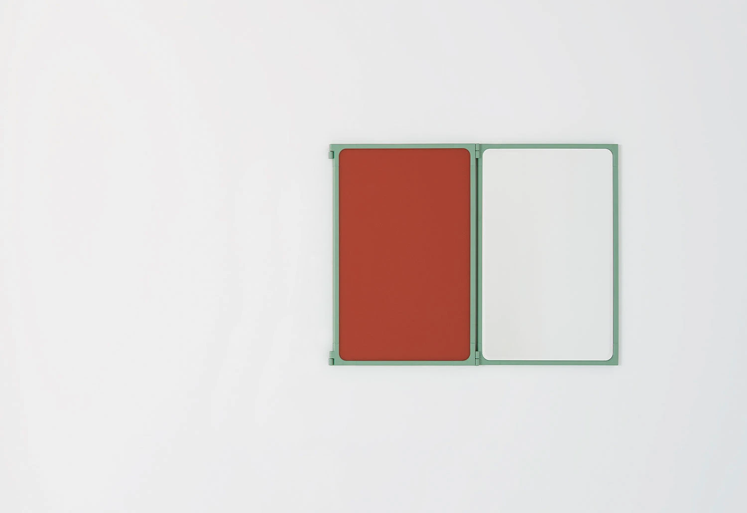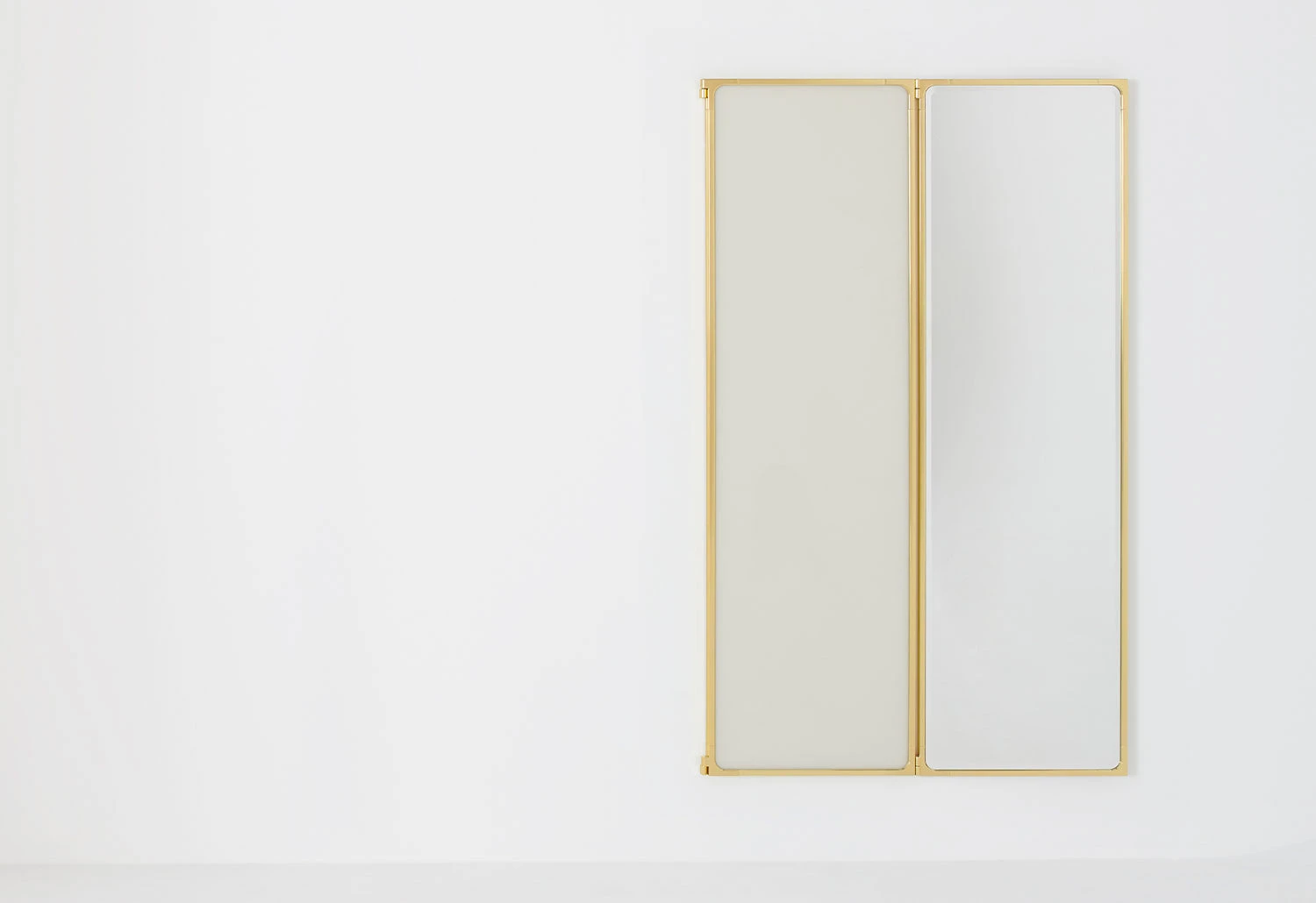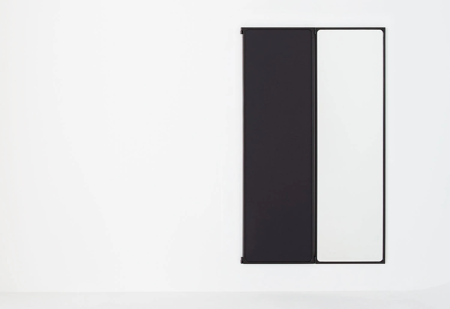 It features three panels connected via pin hinges integrated into the frames. The central panel is fixed to the wall whilst the side panels pivot, allowing them to be partially or entirely opened.