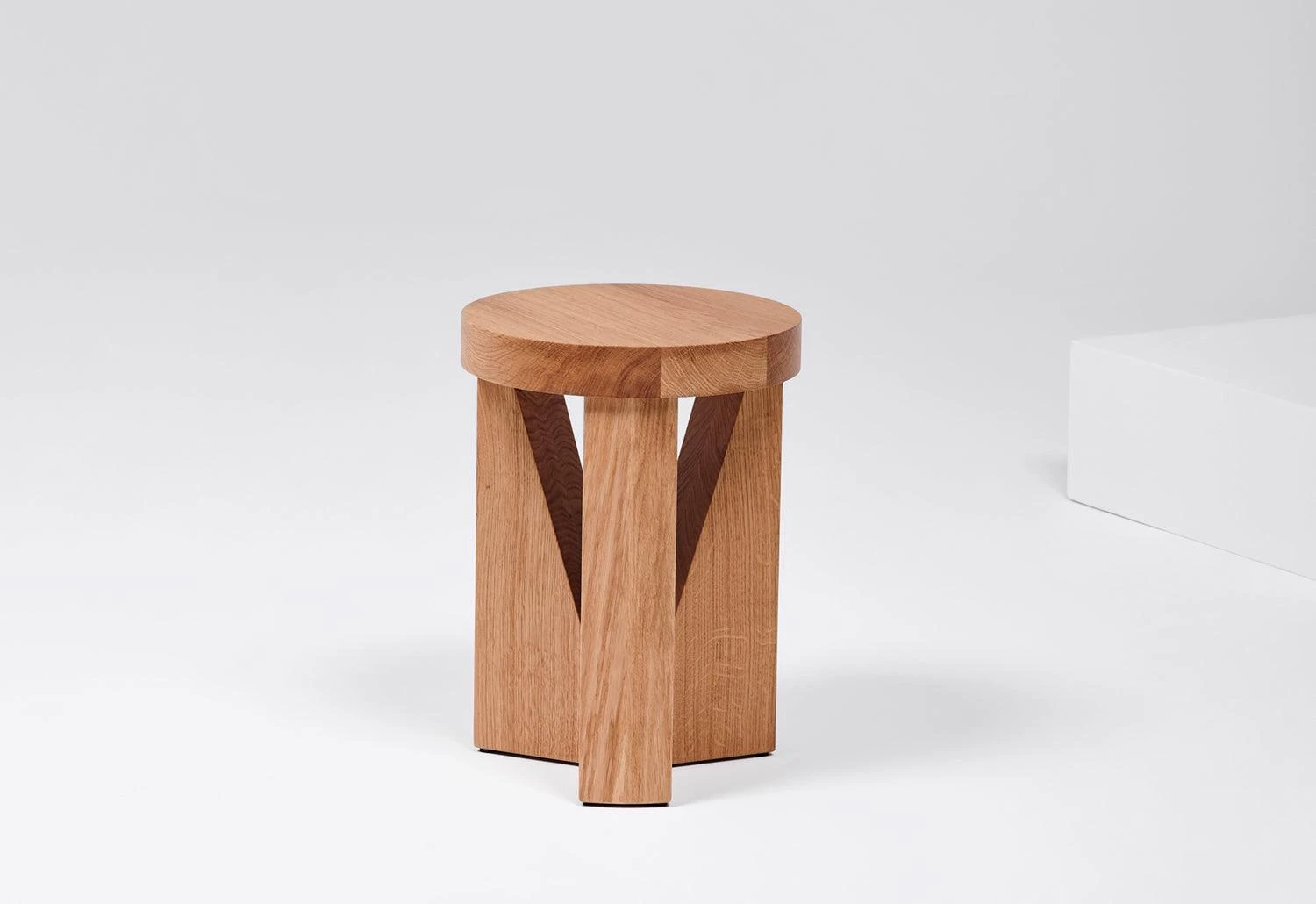 The Cugino is a well constructed wooden object that is in between being a stool and a low table. Konstantin Grcic has experience in woodwork and experimented with form to find an object that is open for interpretation and without formal function.