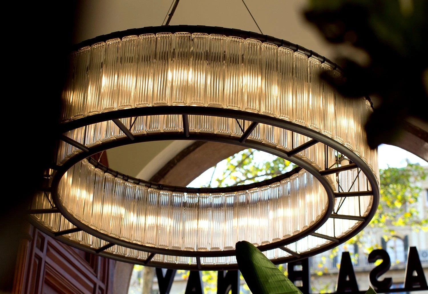 The Estadio pendant lamp is a powerful ring of light made of glass blocks that blazes and projects light. It has been installed in such distinguished settings as the Olympic Stadium and the Diocesan Museum of Vic. The metallic structure is evocative of medieval iron lights, whilst its atmospheric projection of light is wholly timeless.