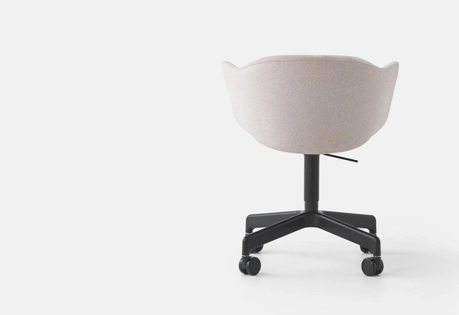 The chair is available with a die-cast aluminium base in black or white and can be upholstered in a diverse range of materials and colours, allowing the user to personalise it to their space.