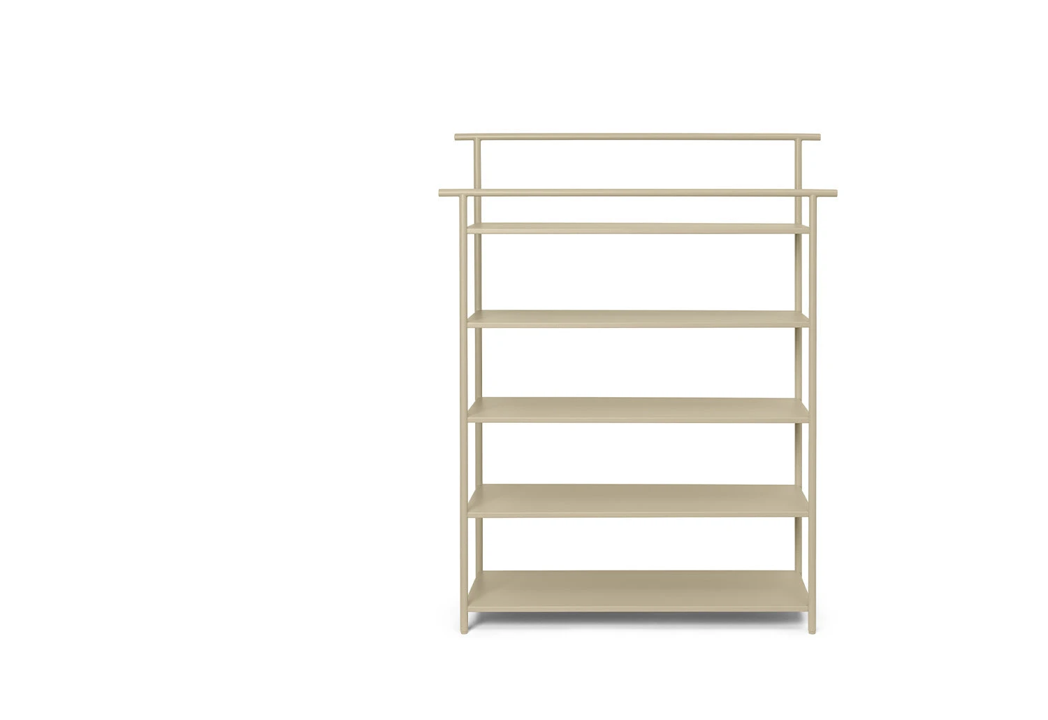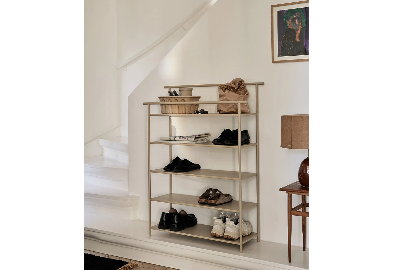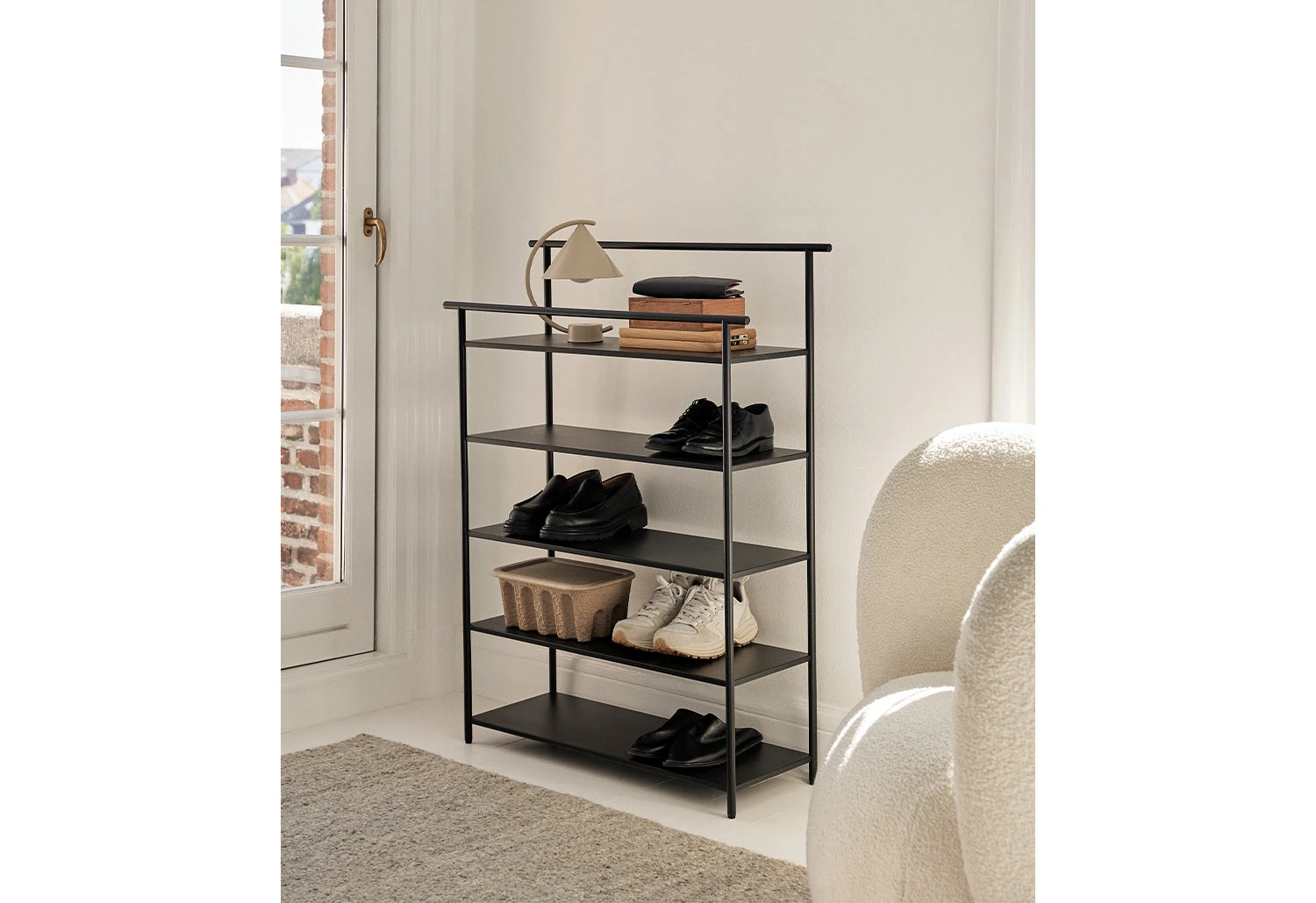 Introducing the Dora Collection: a line of functional and minimalist furnishings. The Dora Rack, made of powder-coated iron, boasts five spacious shelves for storing shoes or organizing various items throughout your home. Its modern design makes it an excellent addition to any space.