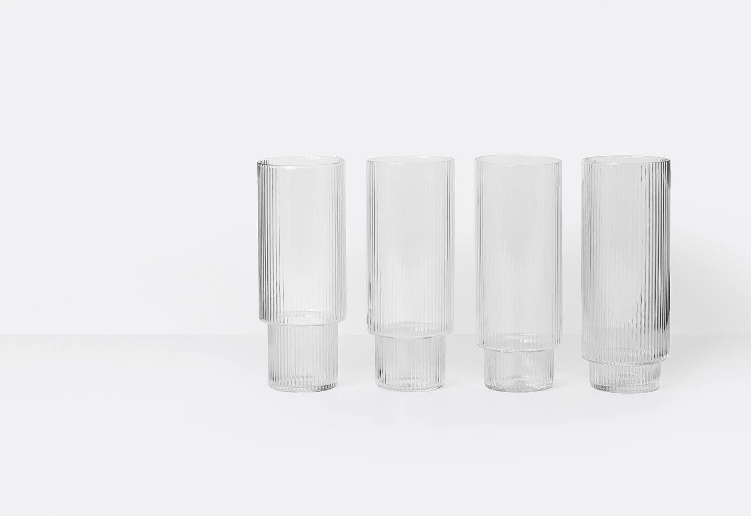Individually hand-blown glasses in four slightly differing designs. The ripple pattern is achieved by blowing the glass into a mould, which adds a degree of elegance to the fine glassware.