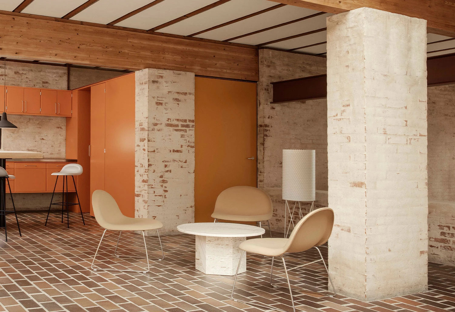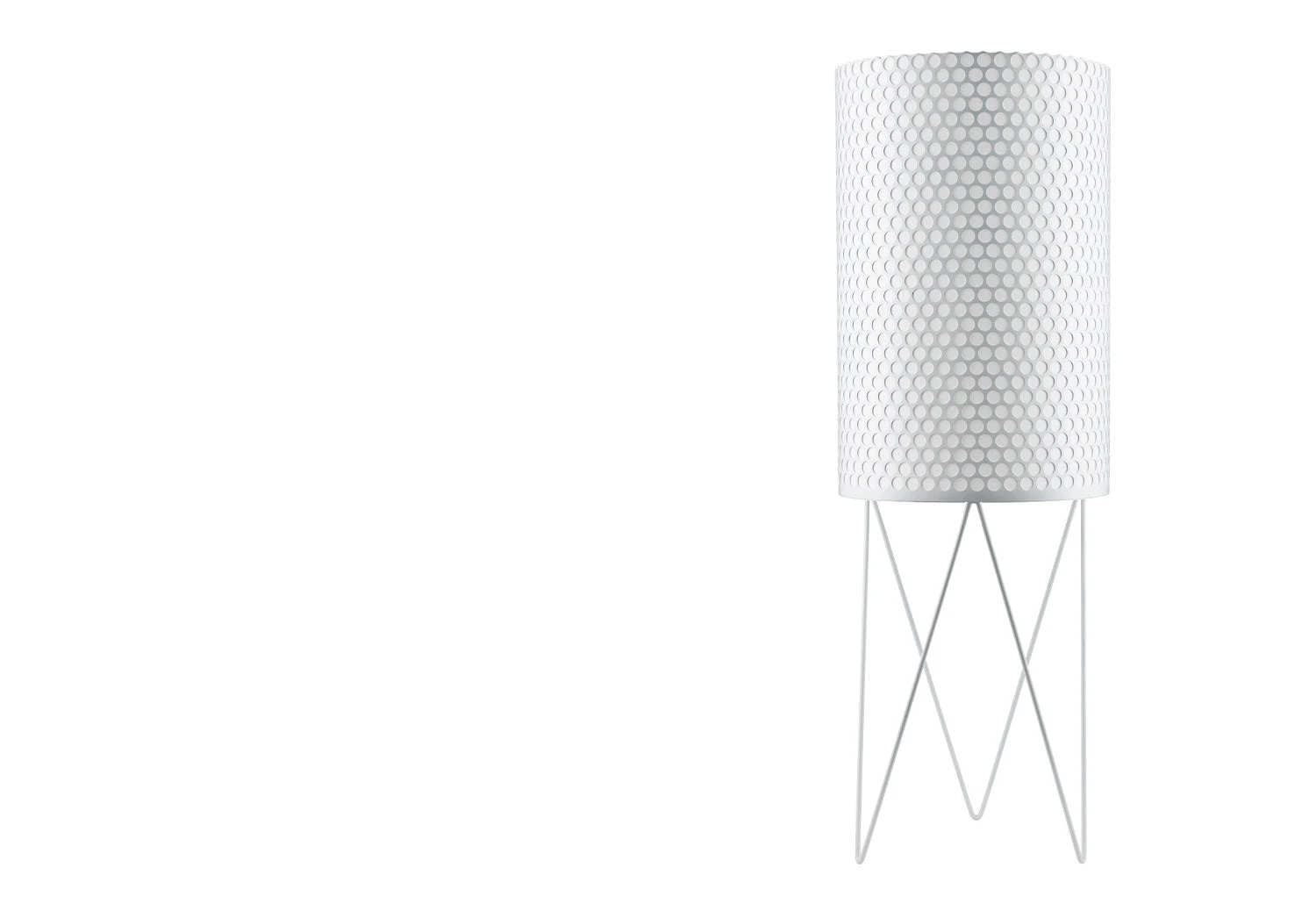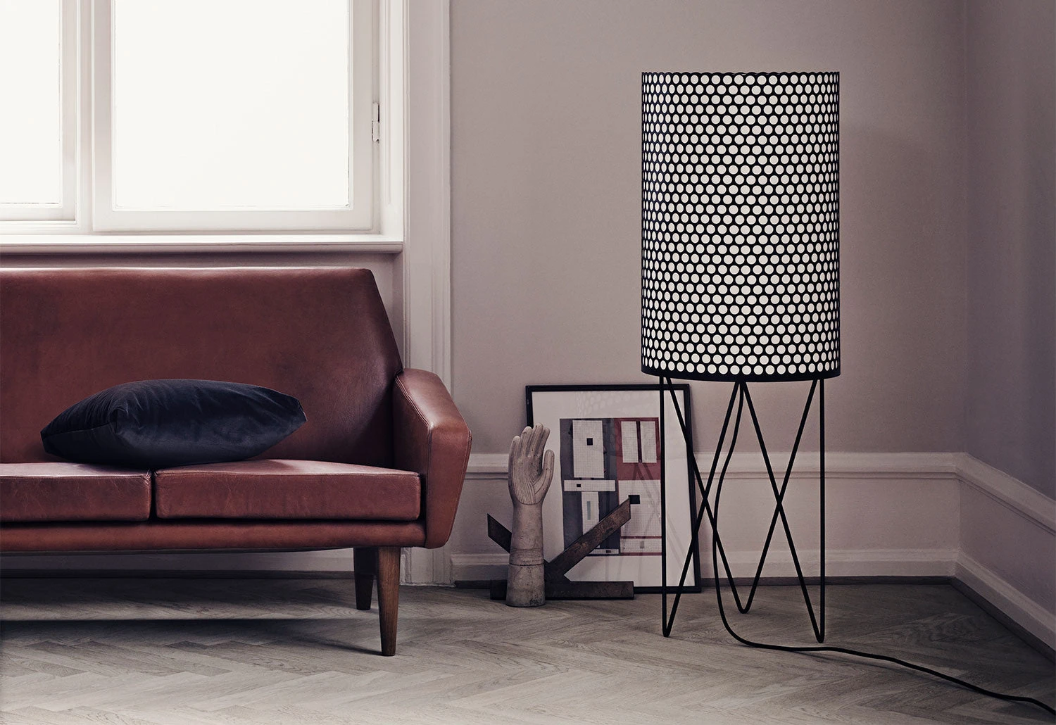 When designing the PD2 floor lamp, Corsini was inspired by the building itself, taking inspiration from the vaulted ceilings to create the base of the light and looking to the chimneys to develop the cylindrical form and perforated details of the lampshade.