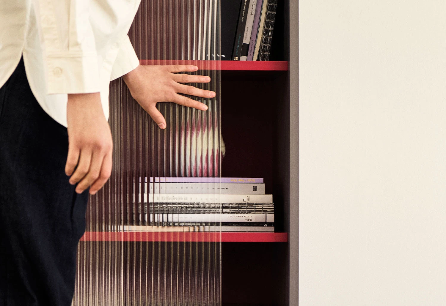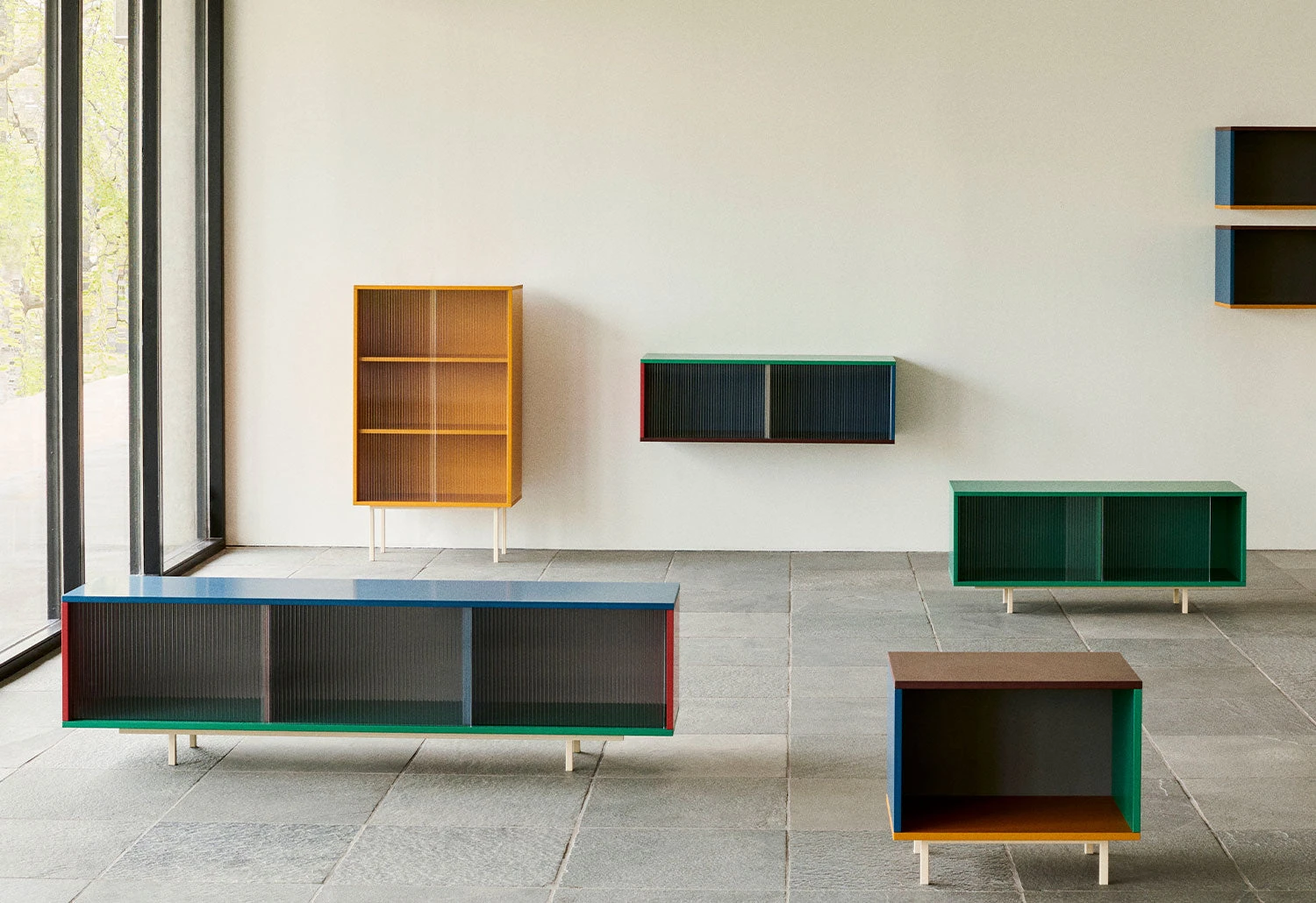 The floor-standing cabinet blends minimalist design with vibrant colour and is available in two different finishes: yellow and multi-coloured. It features two semi-transparent, glass-reeded doors at its front, softly obscuring its contents within.