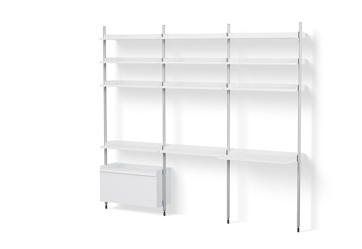 The minimalist shelving is available in several colours and pre-configured combinations, which include practical elements such as flat shelves, wire shelves, work desks, cabinets and clothing hooks. The combinations can be used alone or combined to create custom systems for your environment.