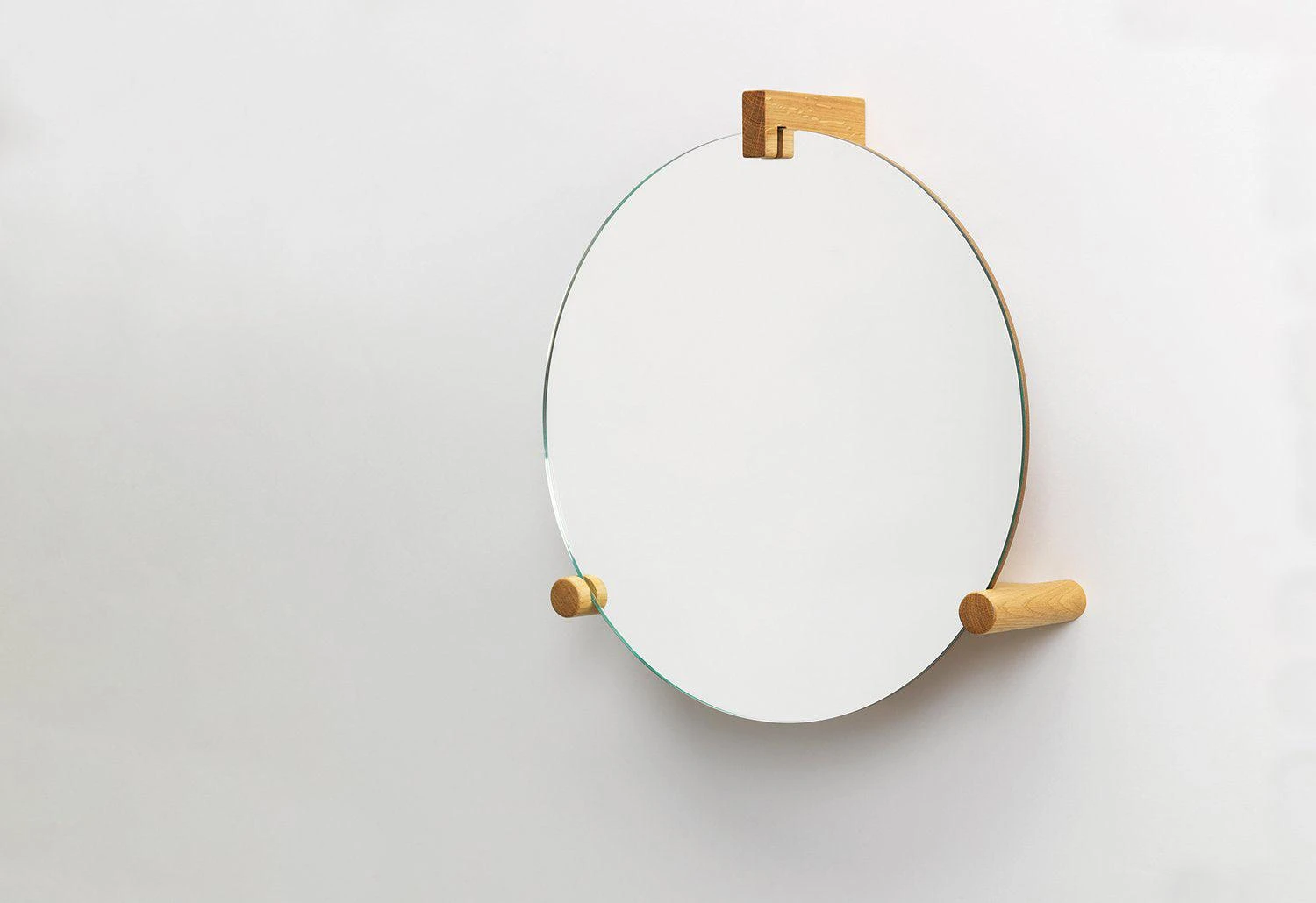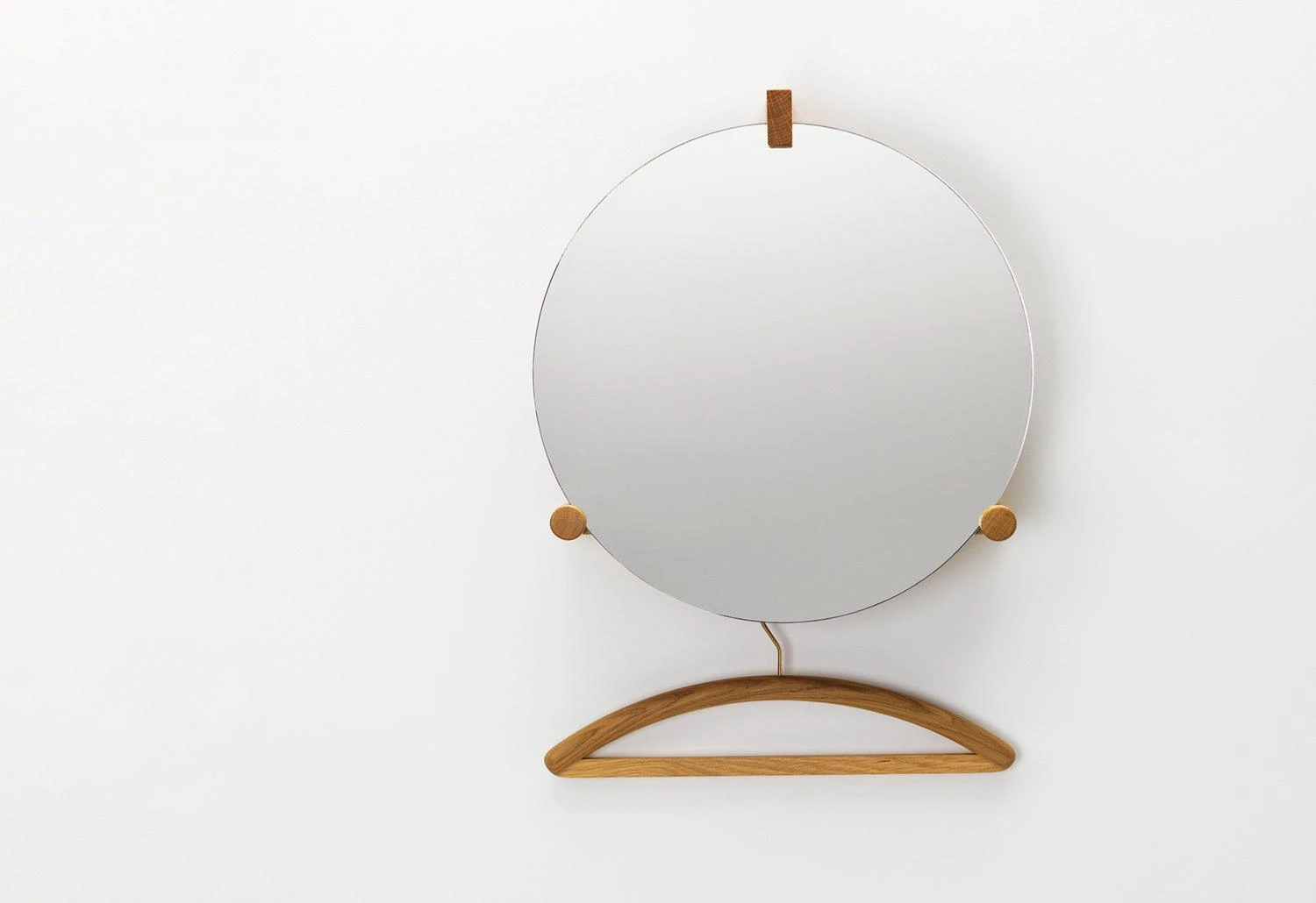 A round wall mirror with wooden accent mounts, hook and shelf. The contemporary and compact design works well in a dressing area, hallway or bathroom.