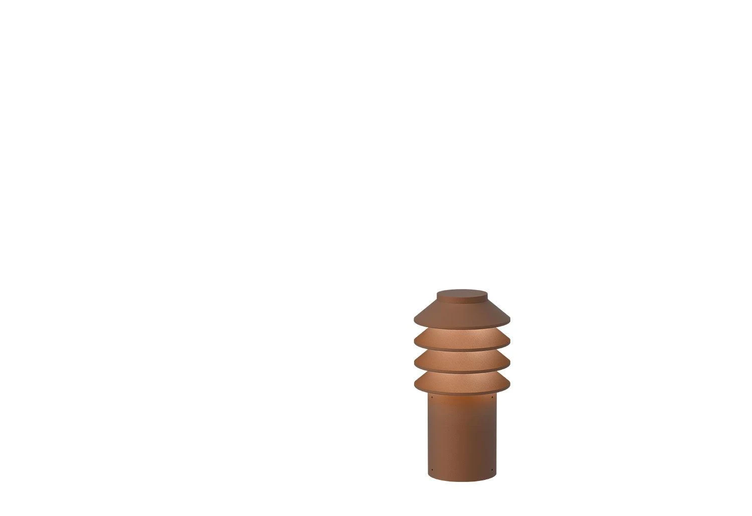 The concept for the lamp was to produce an exciting pattern by reflecting the light downwards via multiple circular shades. The bollard was produced in corten steel, a material considered revolutionary at the time.
