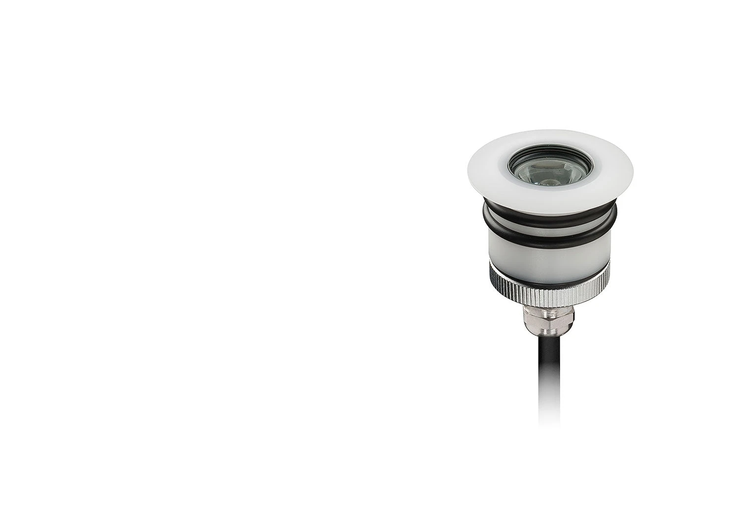 The Lux Outdoor light is a recessed LED spotlight for use above ground outdoors or up to 1 metre underwater. It is available in two finishes; sanded chromed brass or techno-polymer body, and has glass protection and a waterproof cable gland.