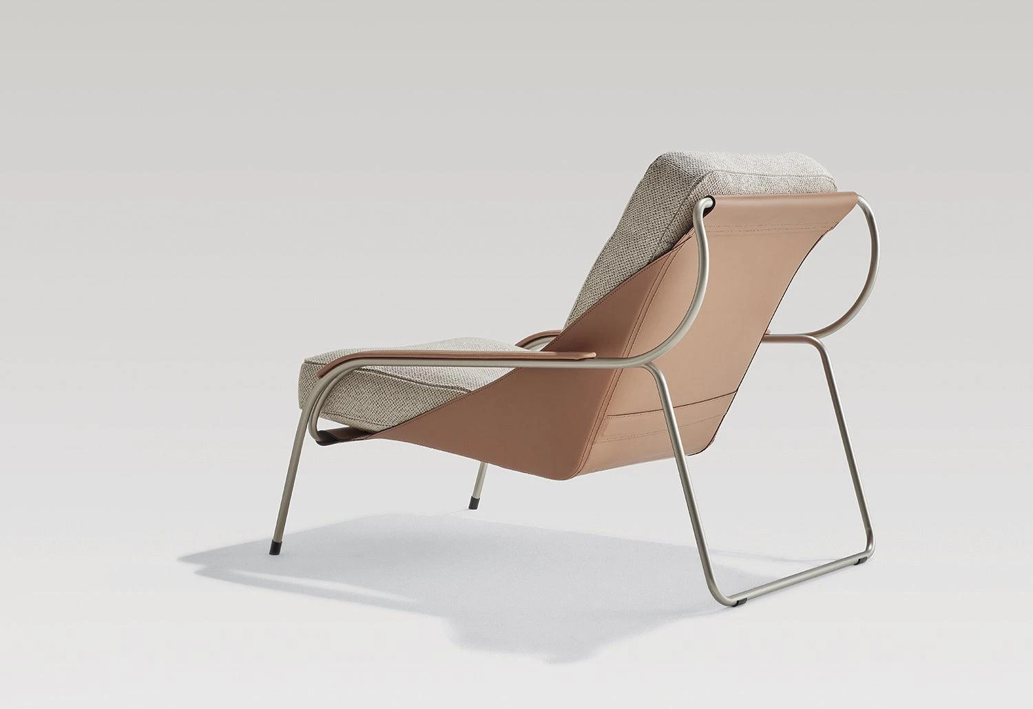 Maggiolina features a curved steel tubing structure from which a burlap ‘bag’ is hung, the ‘pockets’ of which contain two panels of plywood to support the two padded cushions that make up the seat and backrest.