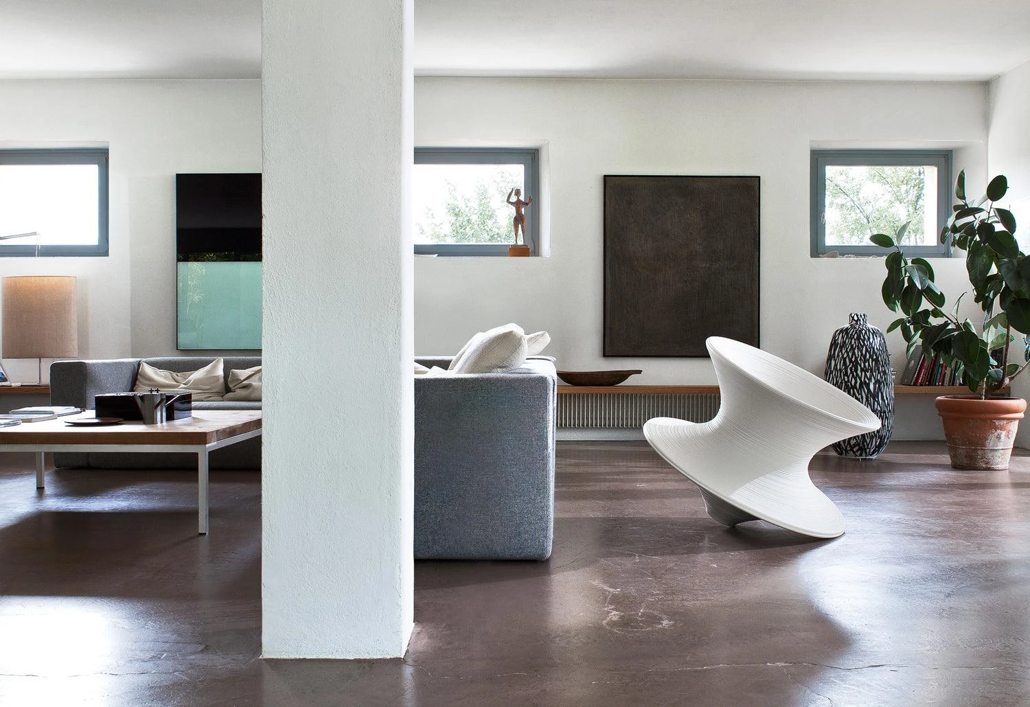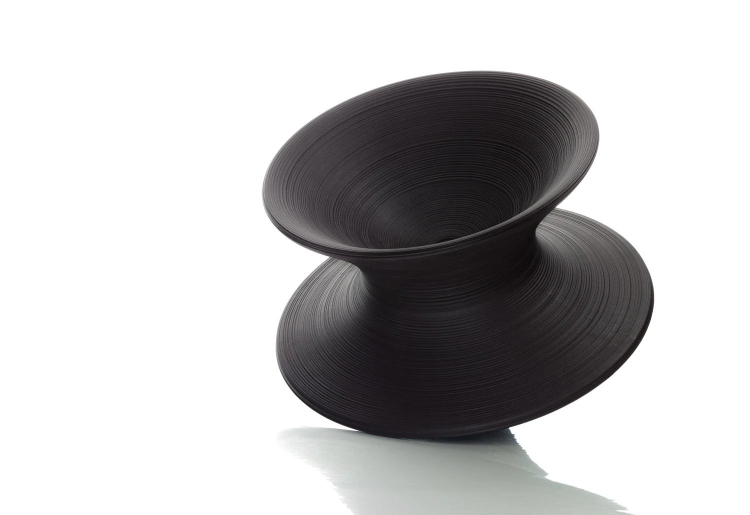 The plastic chair is covered with a detail of fine ridges, like the grooves on an old vinyl record, which add comfort and reinforce the rotational shape of the form.