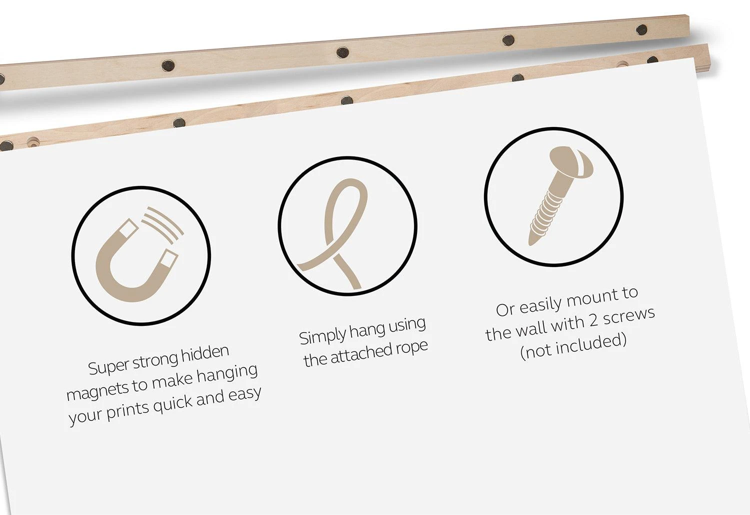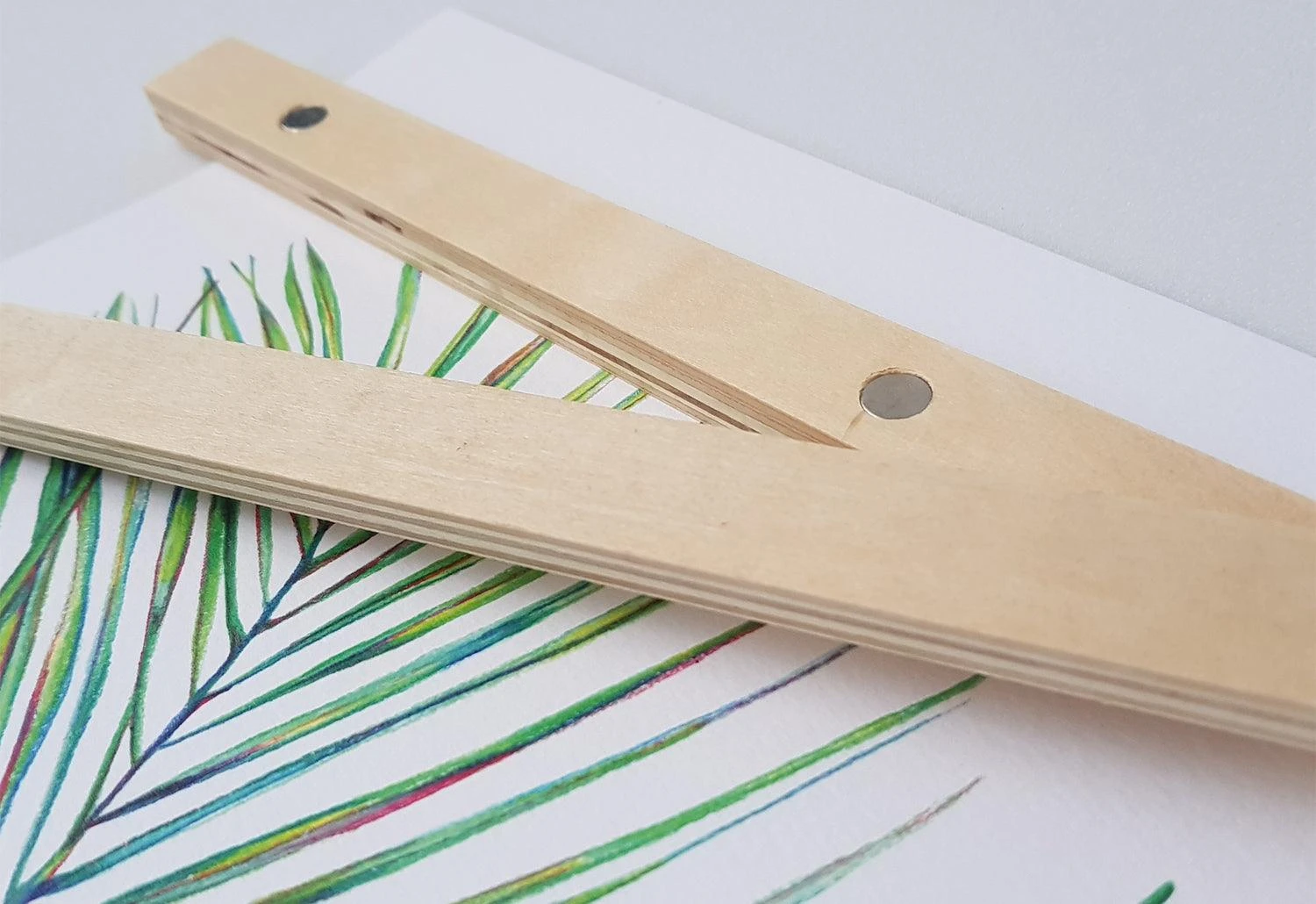 Each hanger set consists of a pair of plywood strips which can be attached to the top and the bottom of the paper you wish to hang. High-strength magnets set into the wood hold the wooden strips in place. Once joined together, the plywood pieces have a seamless square profile.
