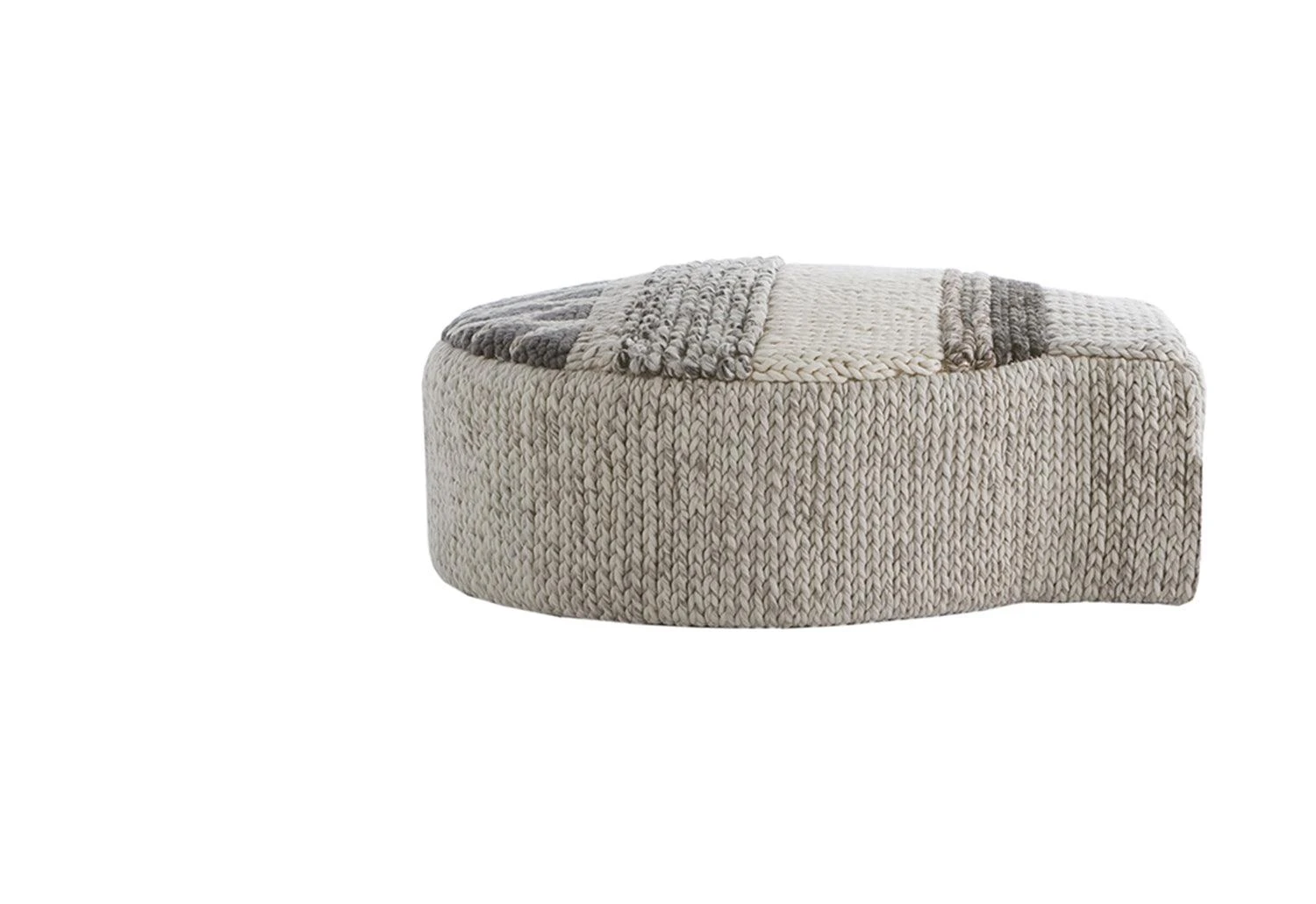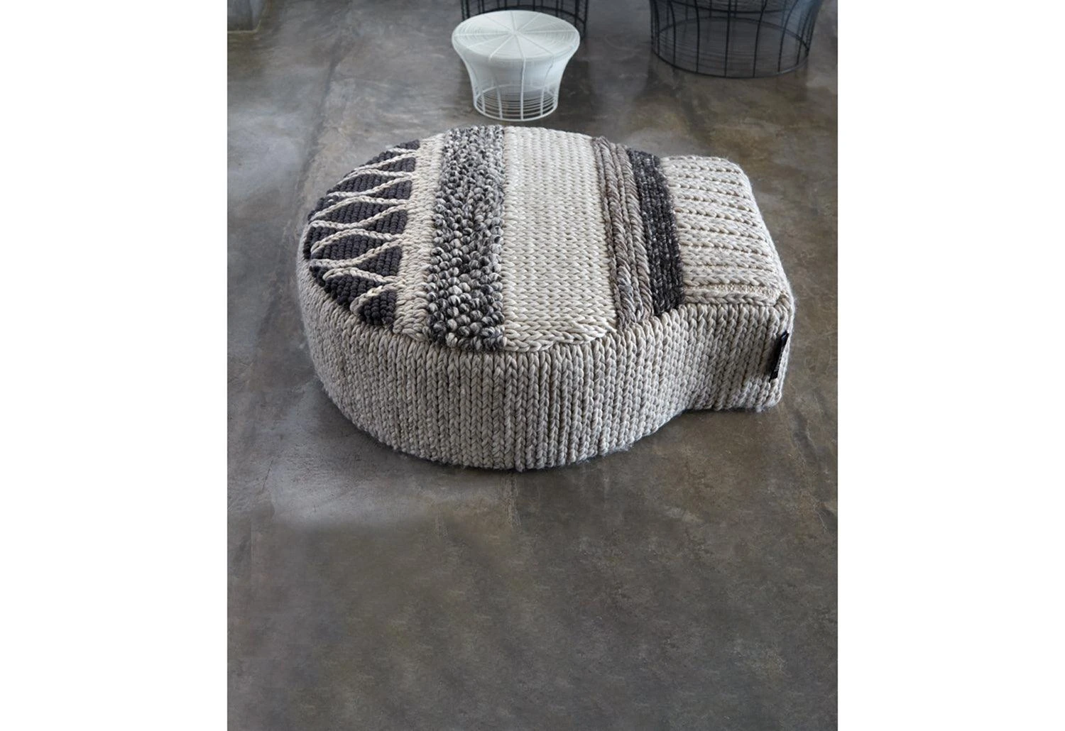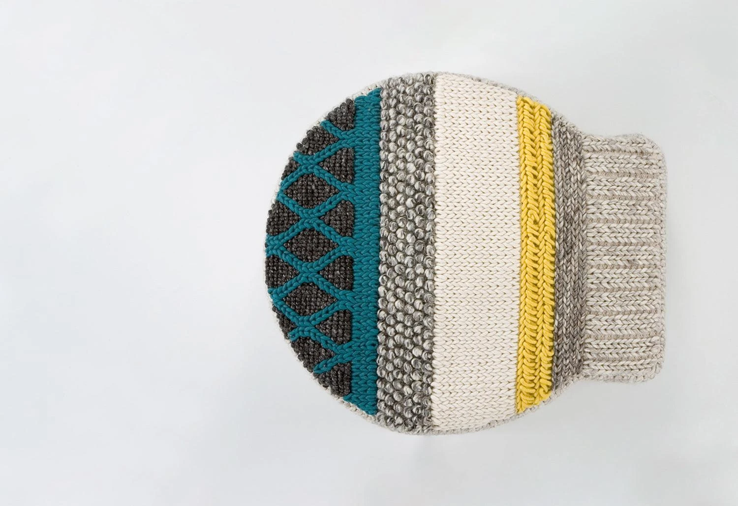 Pouf with a wool cover, the design based on a patchwork of different wool knits. Three different shapes available, to combine as ‘sleeves’ (Mangas) or to work as freestanding elements. Available in two colourways.