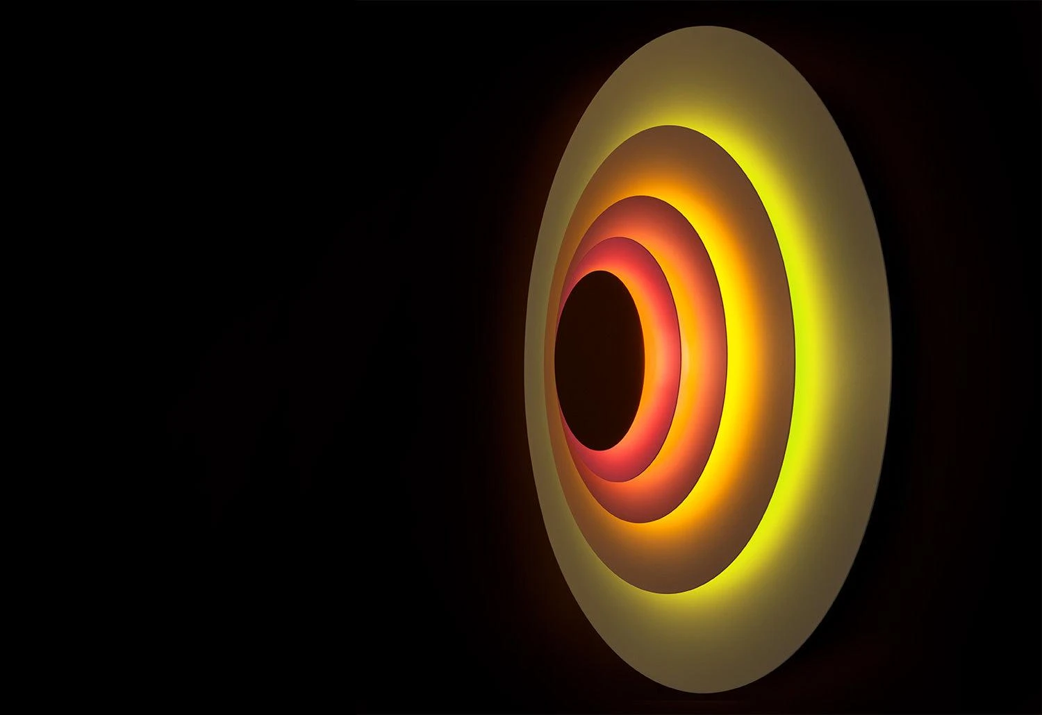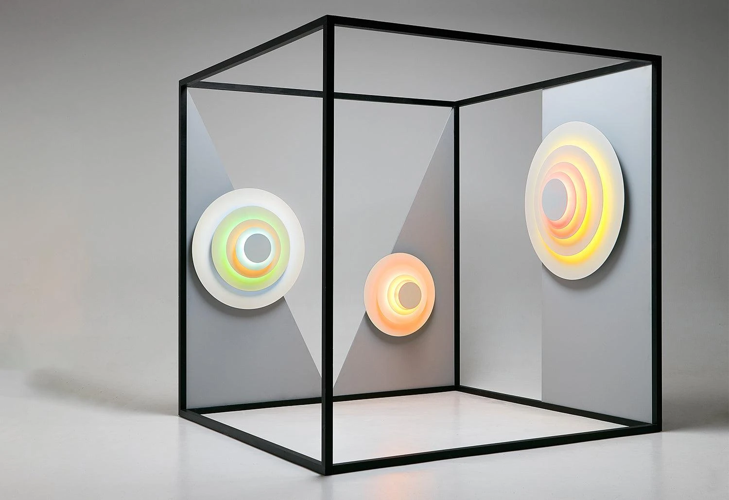 Concentric was born from the designer noticing the sunlight coming through an aeroplane window and reflecting the vibrant colours of the passengers ‘clothes on the white walls.