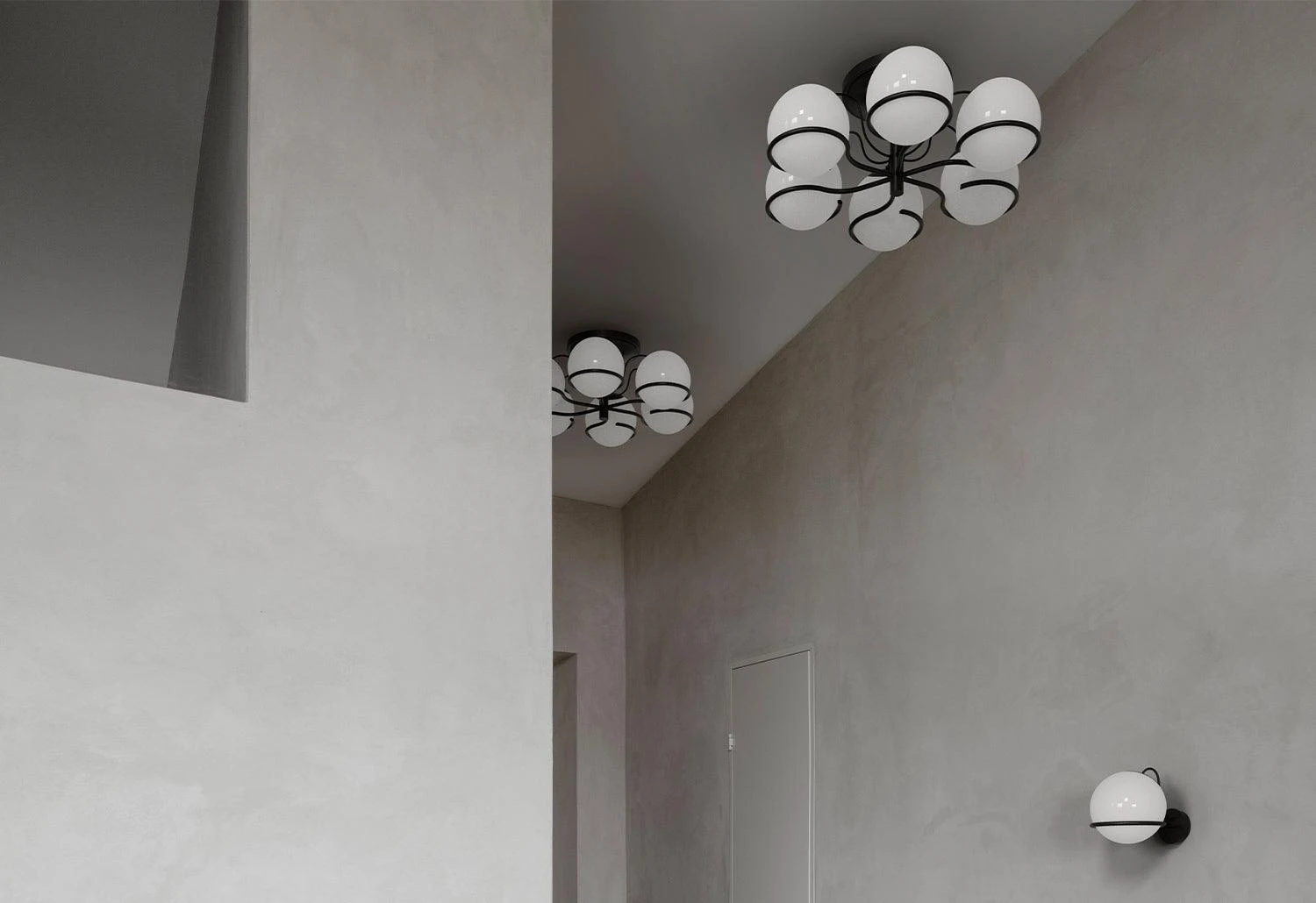 Gino Sarfatti fascination with the gentle illumination of the moon inspired the Le Sfere series, which includes the Model 2042 ceiling light. The Le Sfere collection is a multifaceted, versatile lighting system, excellent for lighting all kinds of spaces with its ambient moon-like illuminating spheres.