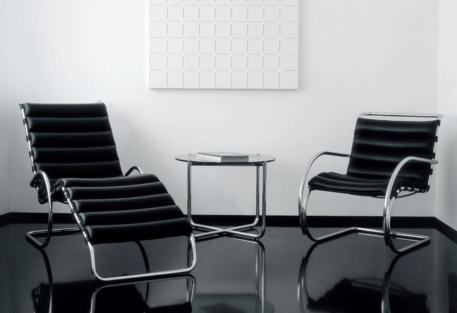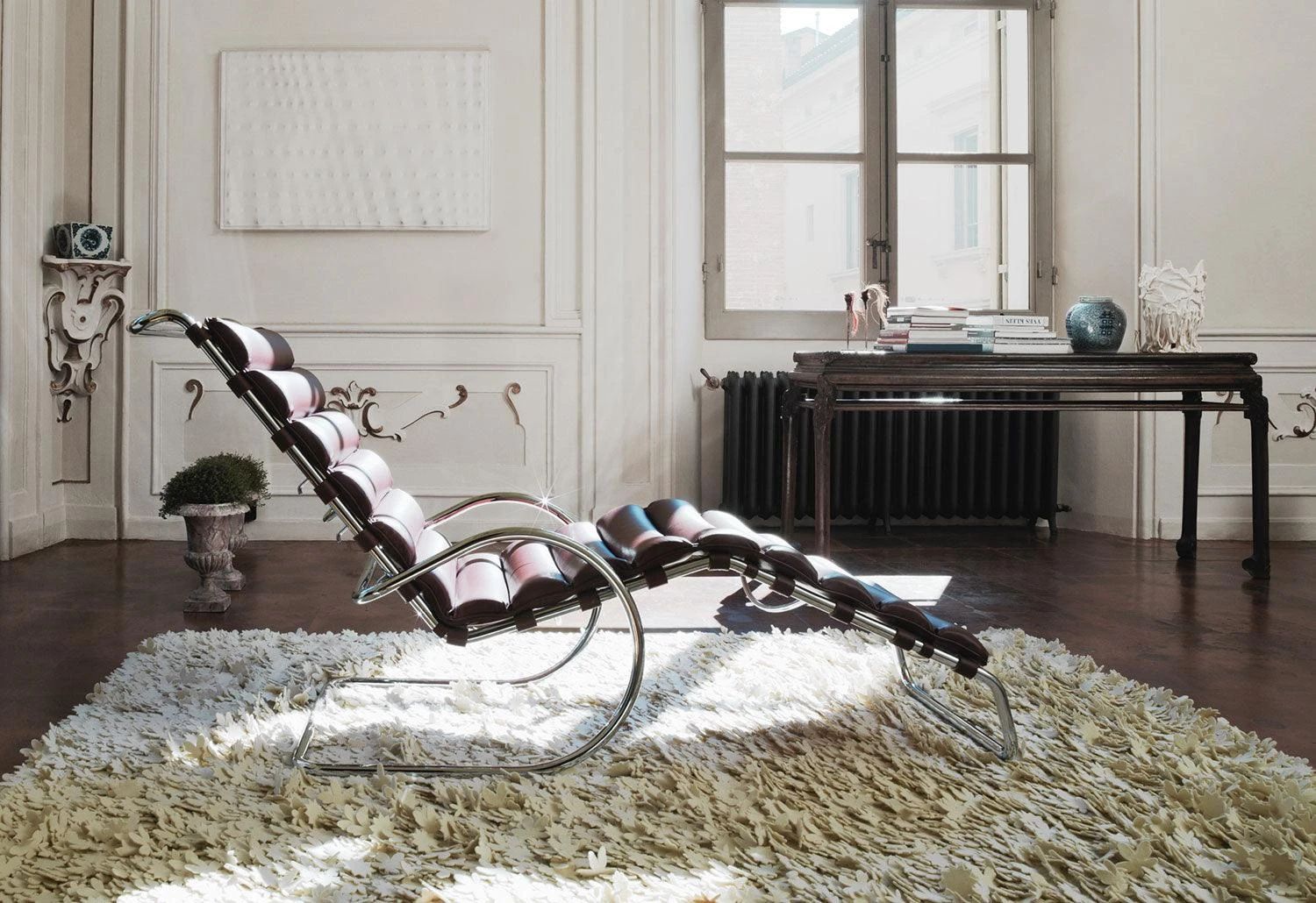 The MR lounge series are some of Mies van der Rohe’s earliest steel designs inspired by the steel creations of fellow Bauhaus alumni Marcel Breuer. Believed to have drawn on the form of 19th century iron rocking chairs, the relaxed adjustable MR chaise longue provides support to head, back, legs and arms.