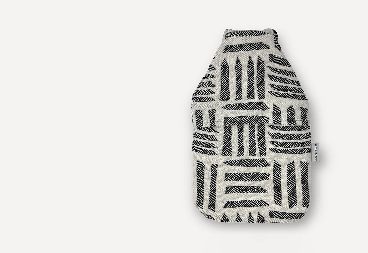 The rubber hot water bottle is encased within a charming merino wool cover, adorned with a simple pattern inspired by the block designs of West African mud cloths.
