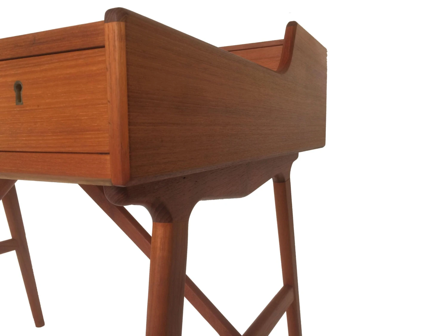 The Model 64 desk is a contemporary interpretation of a classical open front secretaire. The composition being a writing surface, raised upon a leg structure with storage set above the base. Constructed in solid and veneered teak, the arrangement of storage is clearly defined with a hierarchy of drawers and raised shelf. The understructure, with architectural cross-bracing, is subtly sculptured to soften the whole design.