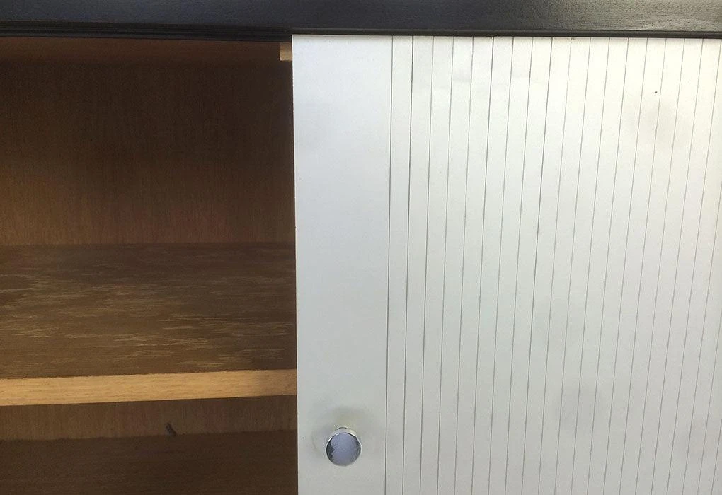 Constructed in wood, aluminium and acrylic, the Poul Norreklit cabinet was one of a family of designs sharing the same mix of materials. The range included a desk, drawer units and shelving. The distinctive combination was produced by Selectform, Denmark to extremely high quality levels and aimed at the top end of the market. The aluminium tambour creates an almost seamless front elevation, whilst allowing for flexible access to the veneered interior without the need for hinged doors. The minimal carcass design is sensitively supported through visually lightweight and futuristic panels of clear acrylic. The use of structural acrylic was used on all the other designs within the family and became a distinguishing element.