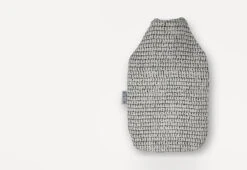 The rubber hot water bottle is encased within a charming merino wool cover, adorned with a subtle grid pattern inspired by Anni Albers’ series of works designed with a typewriter.