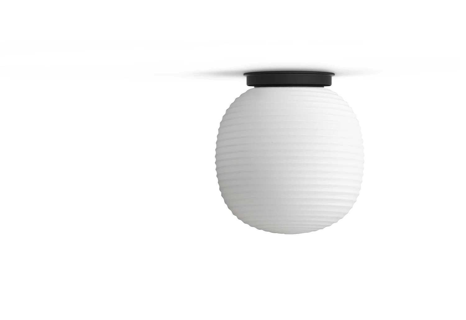 The Lantern range is inspired by the traditional Chinese rice paper lamp. The Lantern ceiling lamp features a frosted glass shade that emits a calm and even light giving the lamp a weightless glow. With the sculptural Chinese lantern-shaped shade taking the centre stage, a simple black base supports its warm glow.