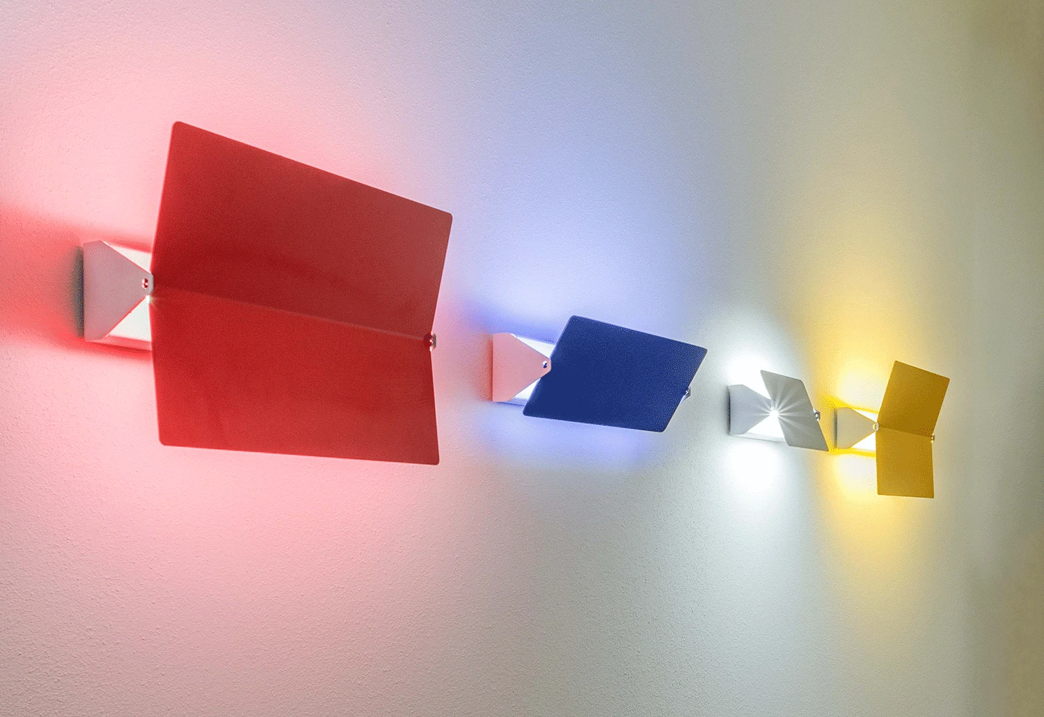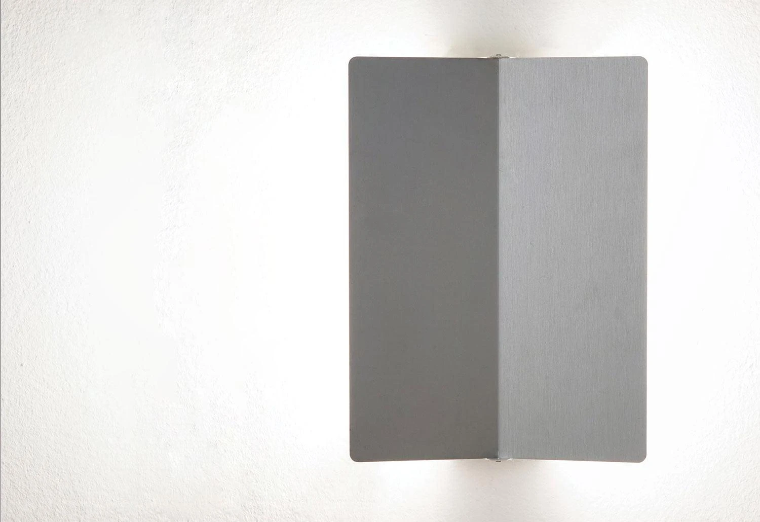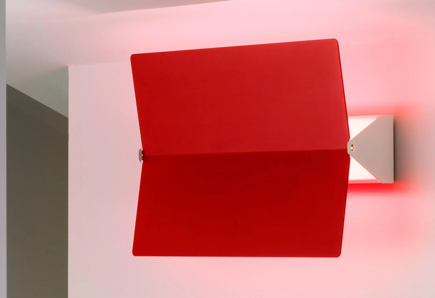 The Applique à volet pivotant plié wall lamp features an aluminium adjustable volet and a metal body. The metal body, which is fixed to the wall, has a white base and holds a metal screen which is available in several different coloured finishes.