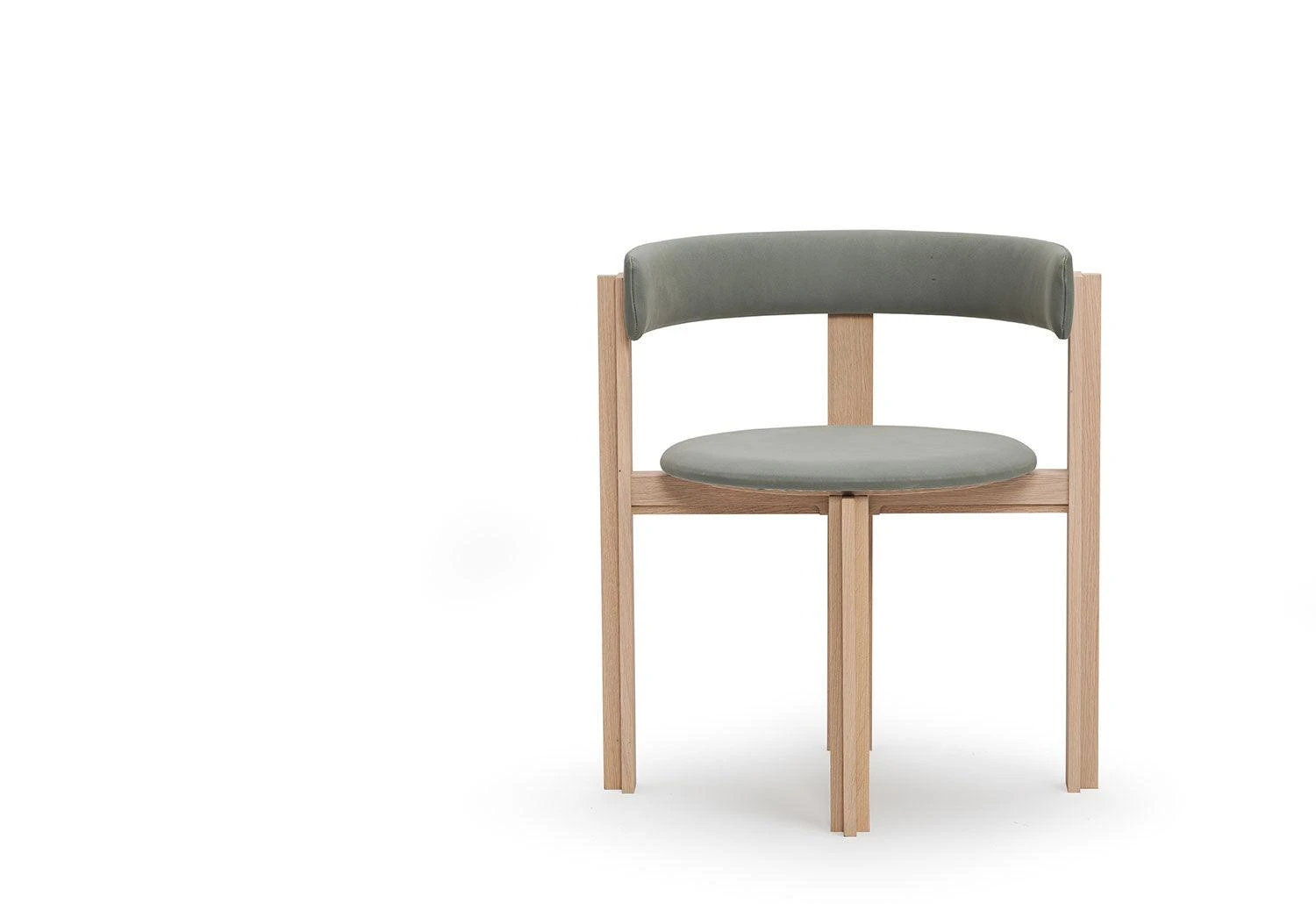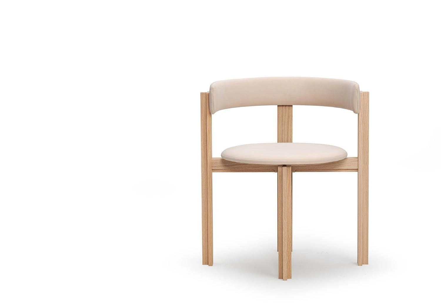 The dining chair features a circular seat with a smoothly rounded backrest, exquisitely upholstered, combining the softness and the free-flowing geometry.
