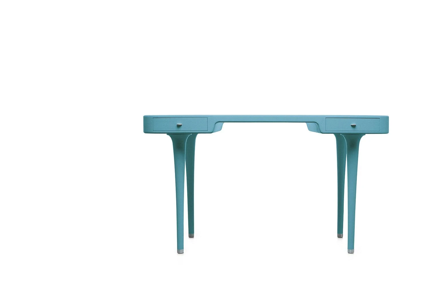 Marc Newson’s Riga table is a functional writing desk with rounded edges. Made of matte lacquered wood, with legs in solid beech wood, the desk is complete with two drawers at either end for conveniently storing paper and stationery.