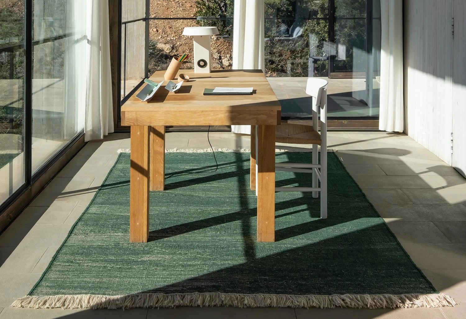 The Telares rug was born out of a combination of techniques used in kilims and typical dhurries, where the pressure of the fibres create a unique range in textures. It is a process where the tension applied between weft and warp giving the rug an appearance full of variation.