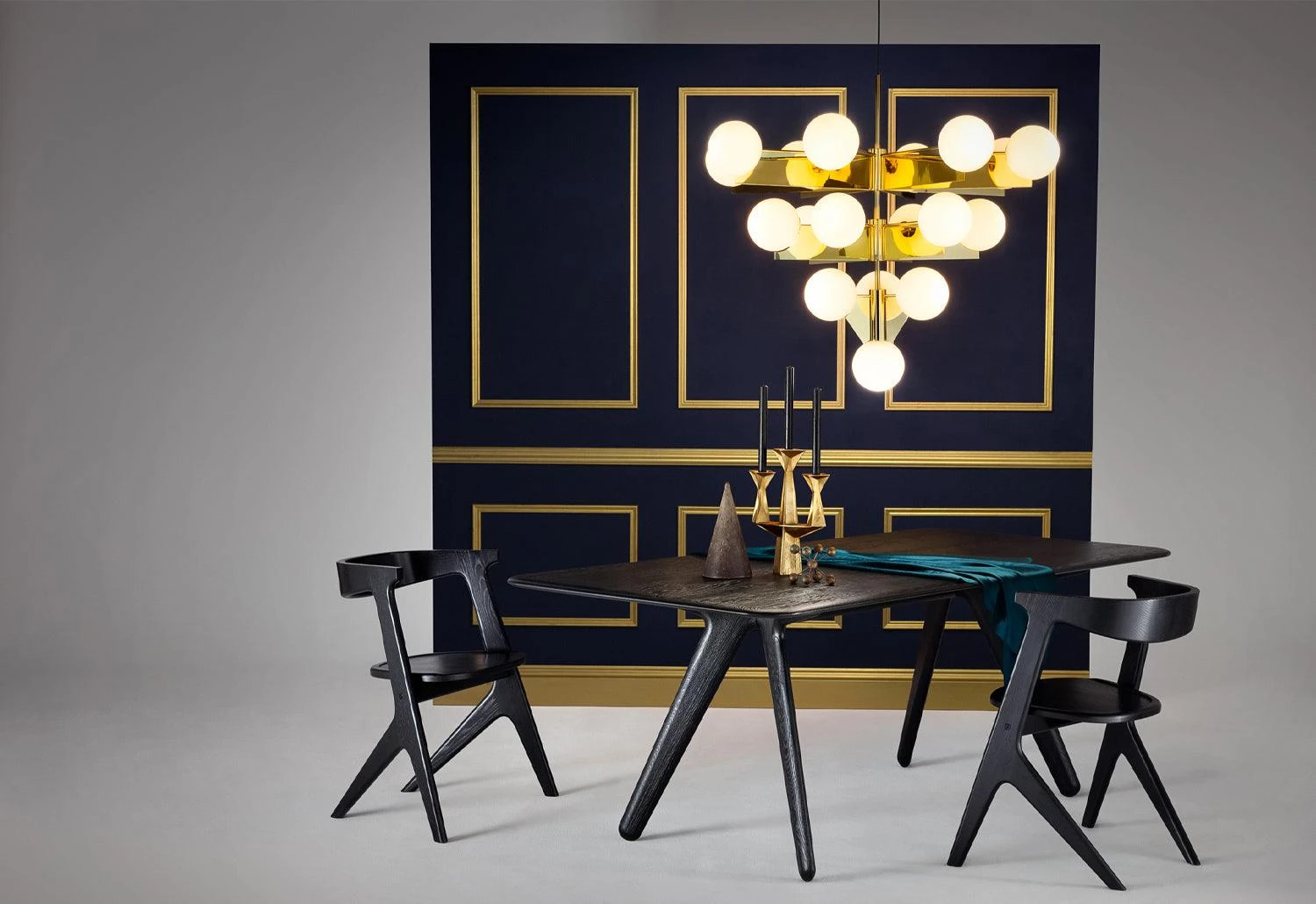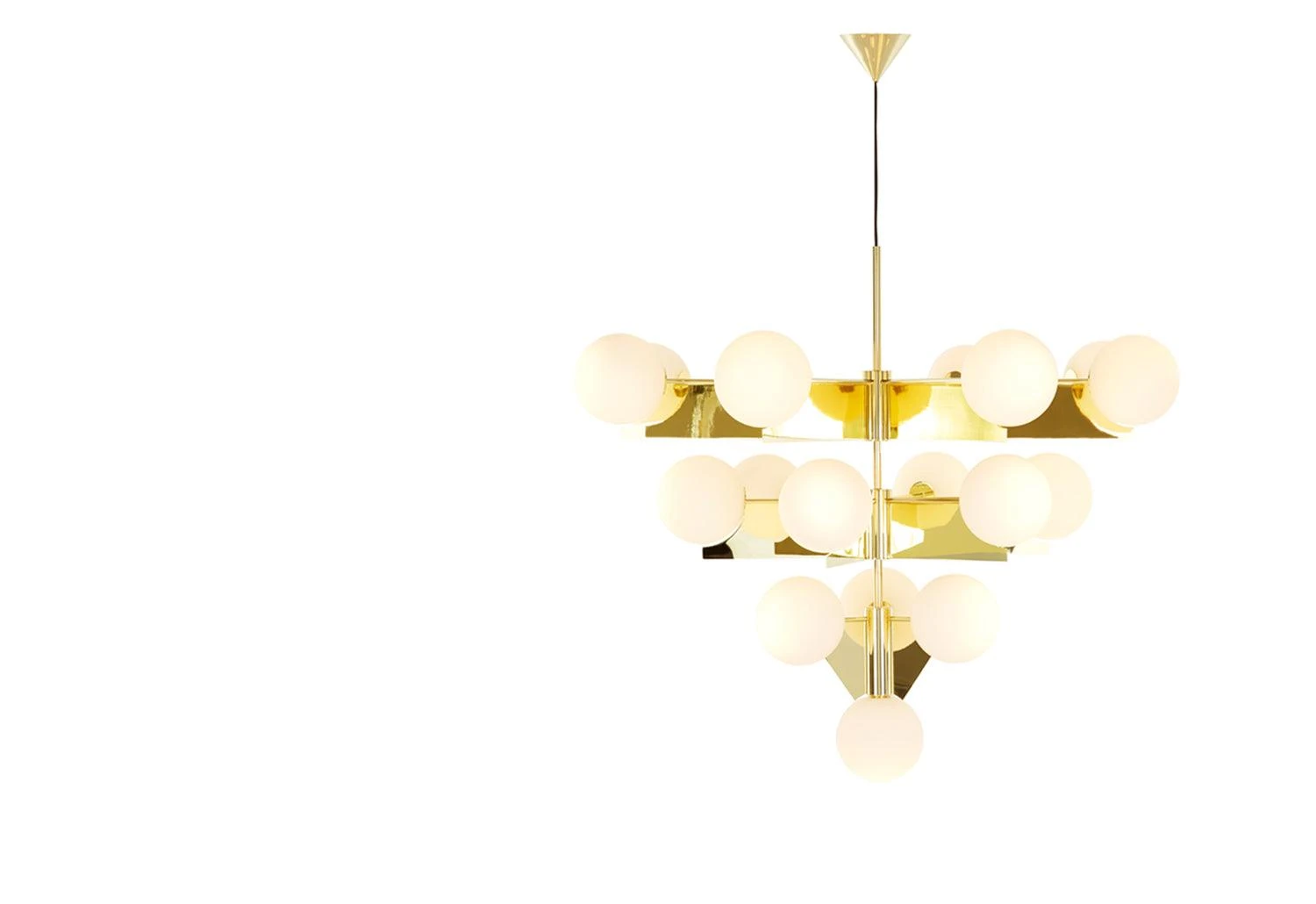 The Plane chandelier consists of eighteen double-layered glass globes arranged in tiers around a sculptural geometric brass-plated frame.