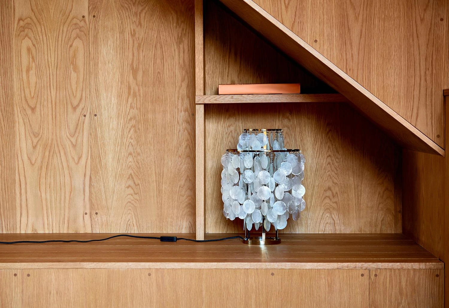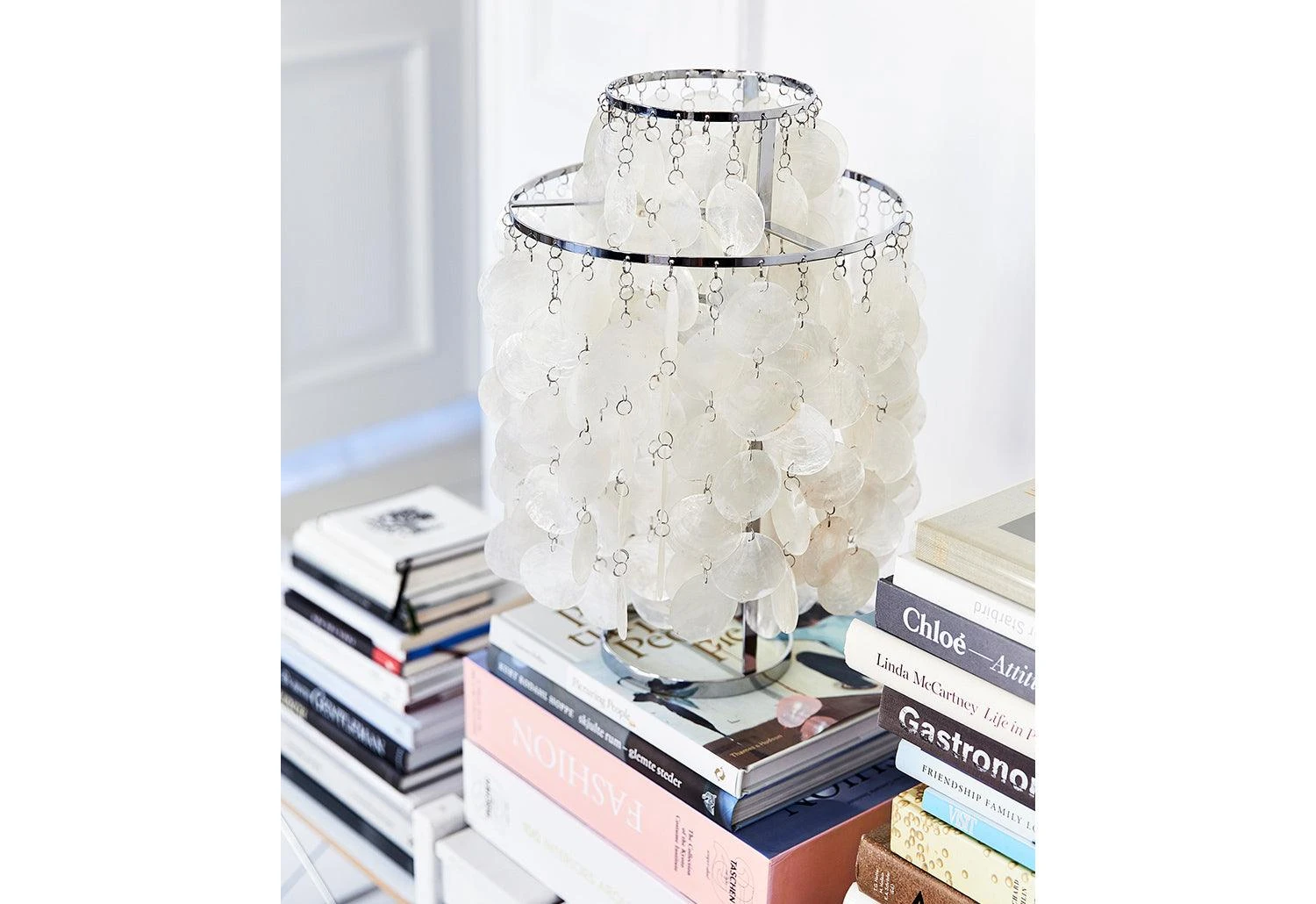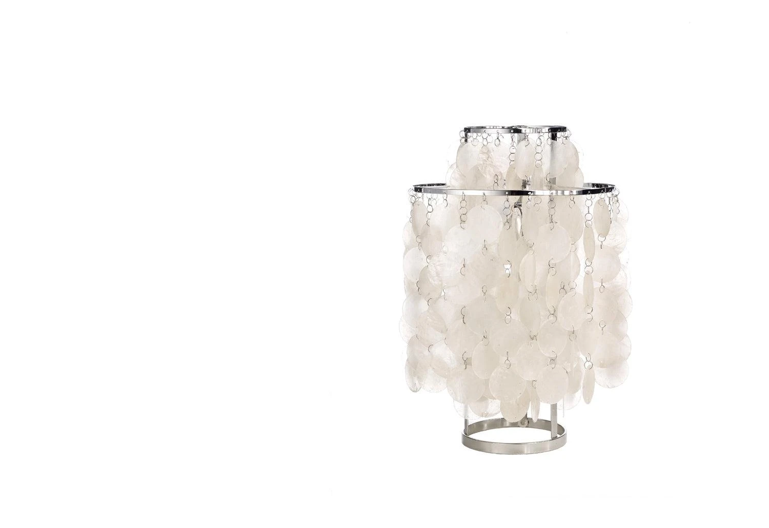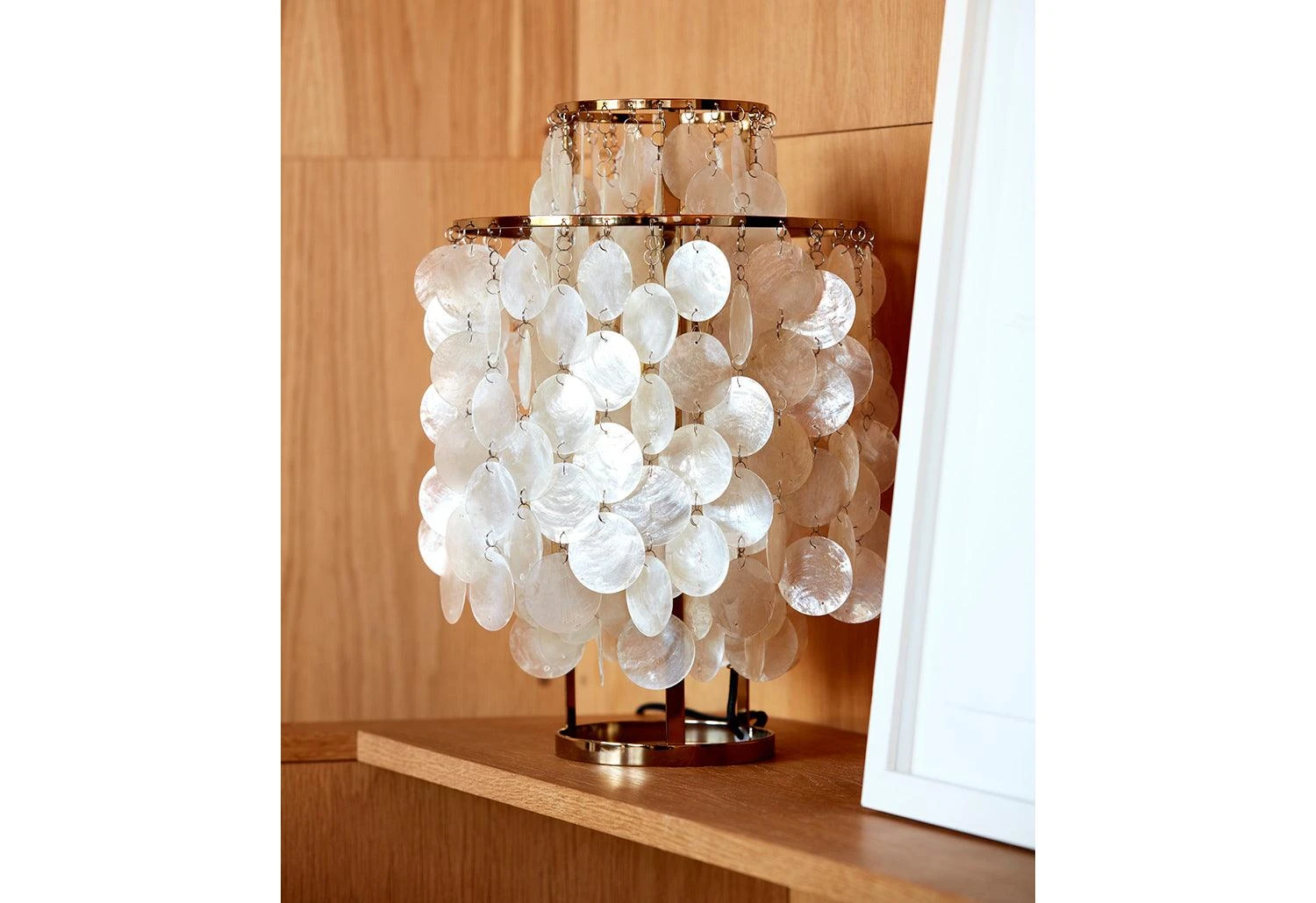 A decorative table lamp with a cluster of the mother of pearl seashell discs attached to metal rings. Panton was often inspired by nature and this design employs natural mother of pearl to great effect. The pearlescent discs give a warm ambience to its surroundings.