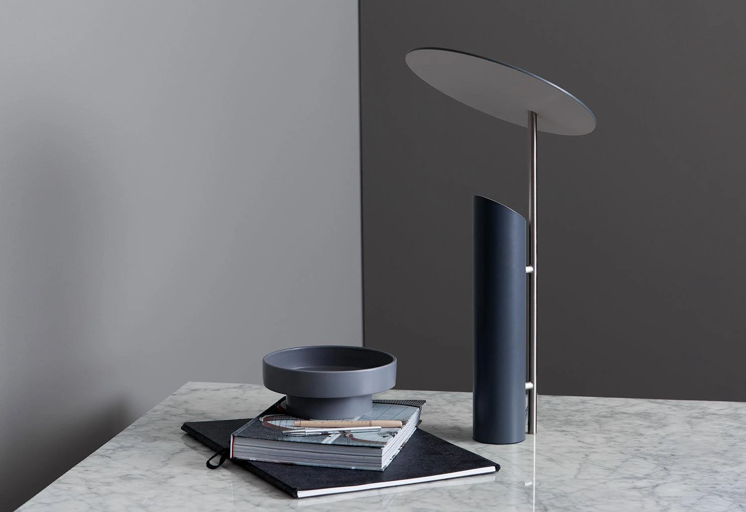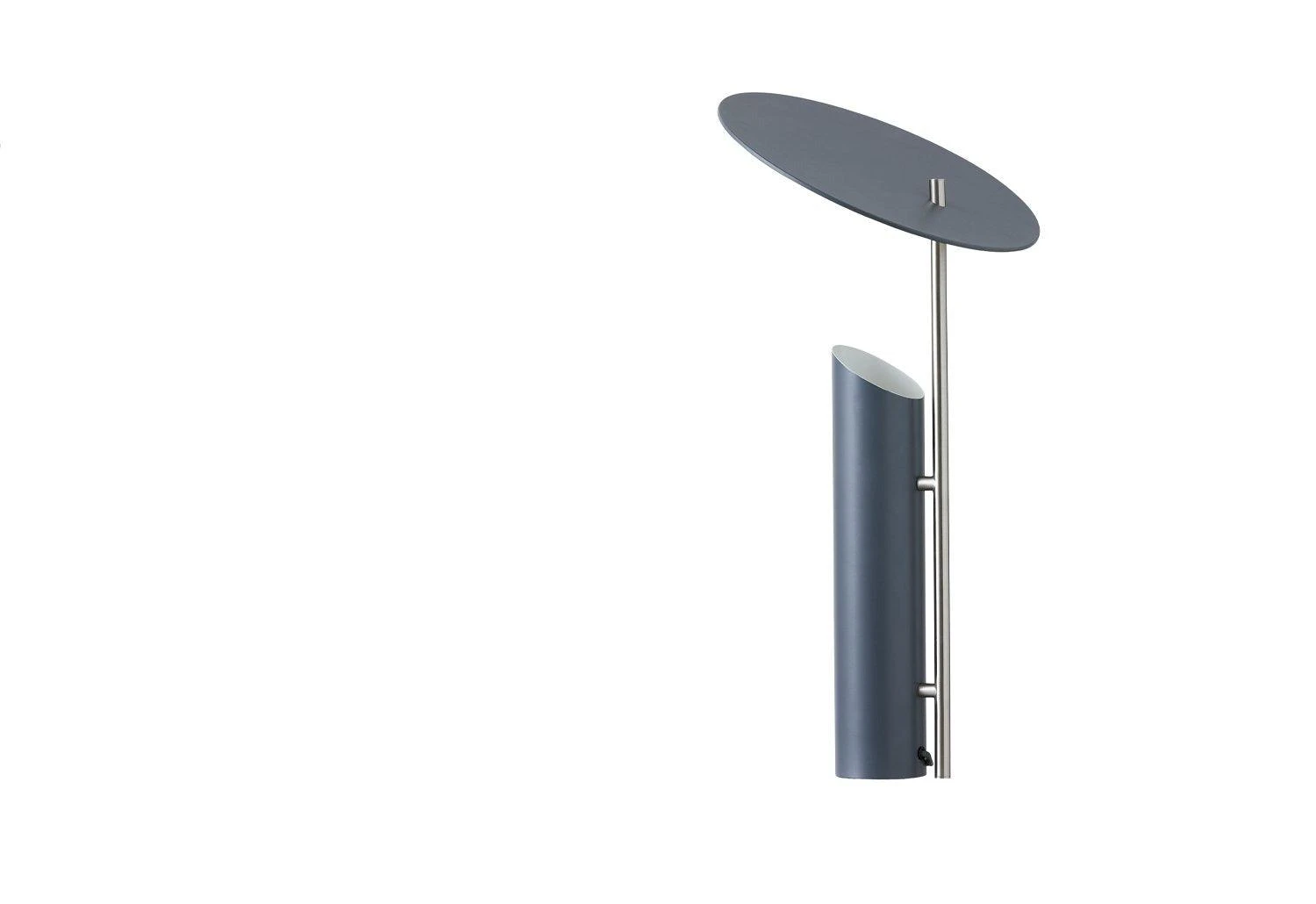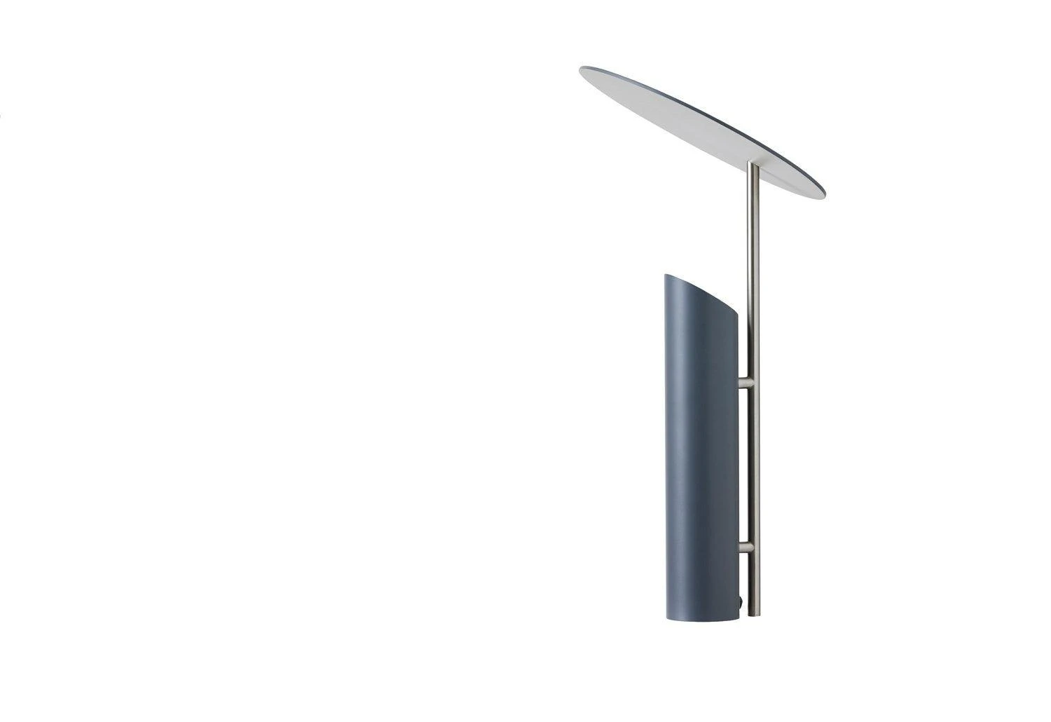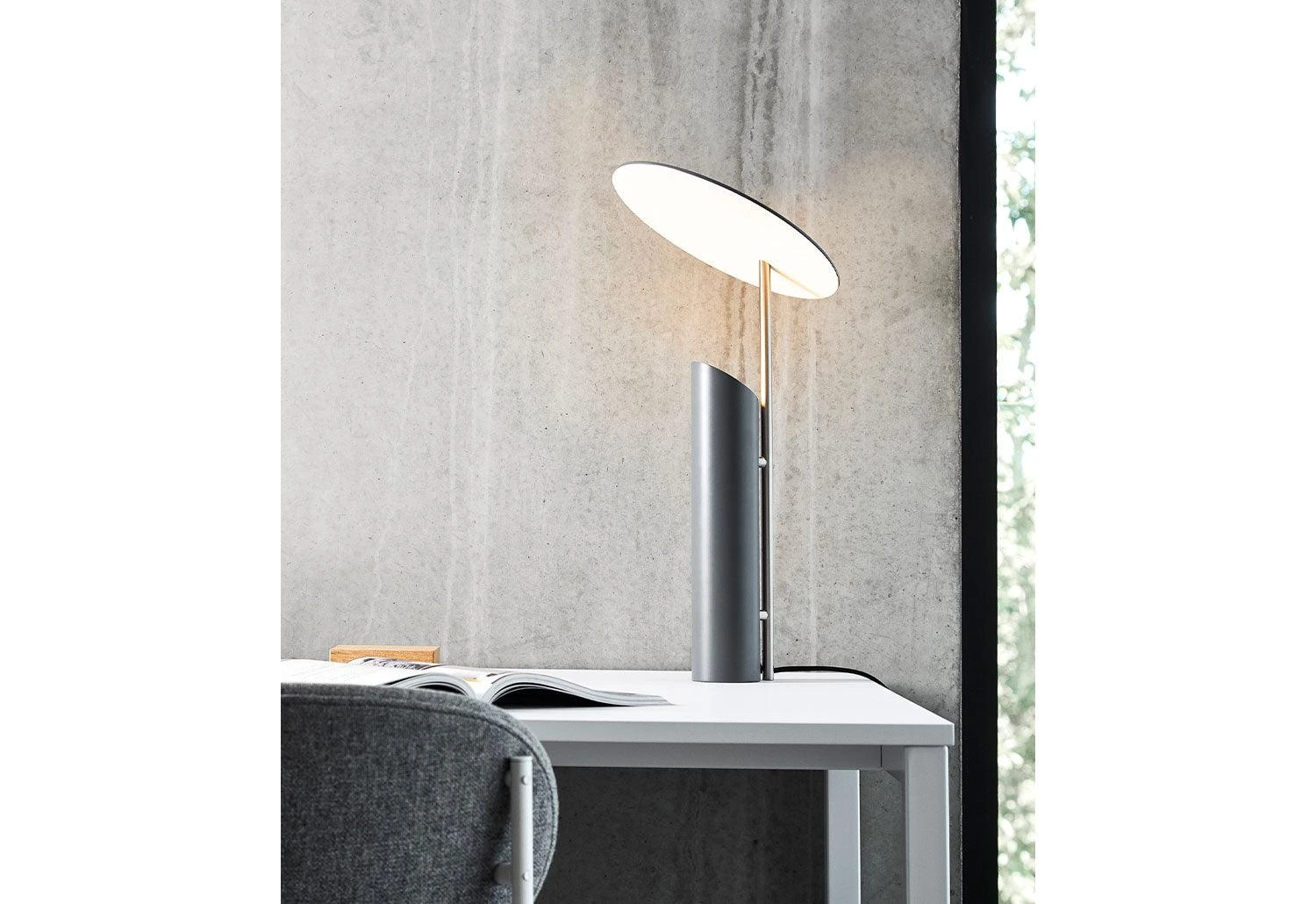 Light is cast upwards from the tubular base and reflected off the white surface of the disc-shaped shade. The shade is slightly slanted, creating a strong yet diffused light.