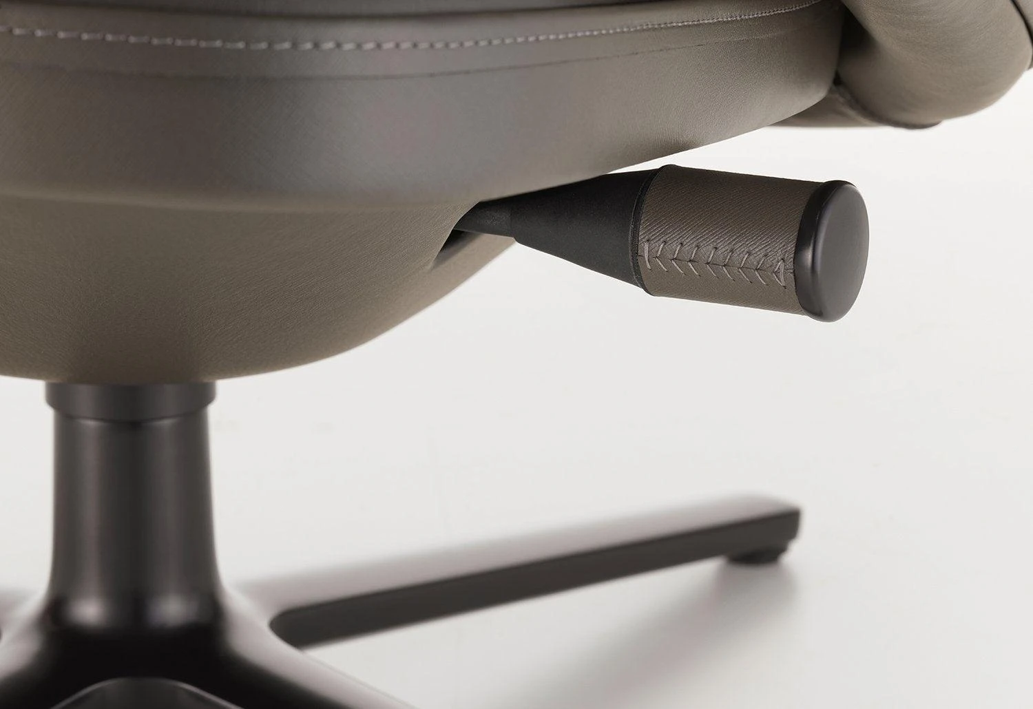 The luxurious Grand Relax combines excellent comfort with compact dimensions. The high-quality leather upholstery gently engulfs the user when sitting down, the concealed integrated mechanism absorbing their weight effortlessly. A control knob can be rotated to adjust the mechanism’s resistance, while the backrest can lock at any angle.