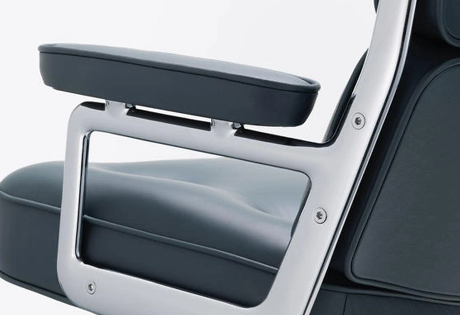 Due to a similar structural design as the iconic Eames Lounge chair, the Lobby chair and Lounge chairs feature the same outstanding seating comfort. The Lobby chair consists of three individual cushions joined by side frames in aluminium.